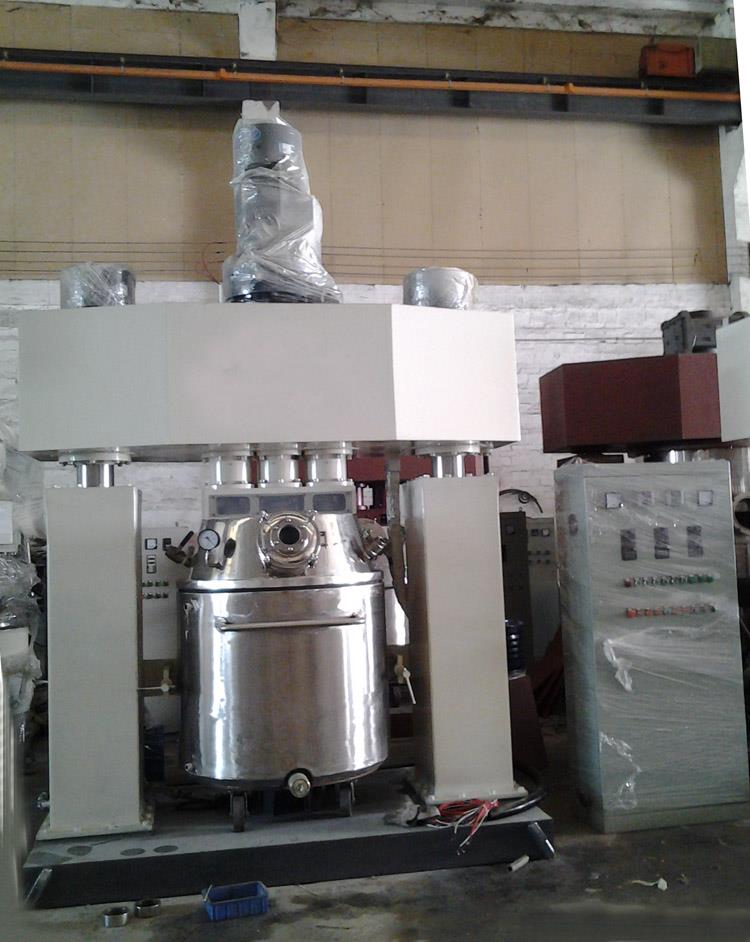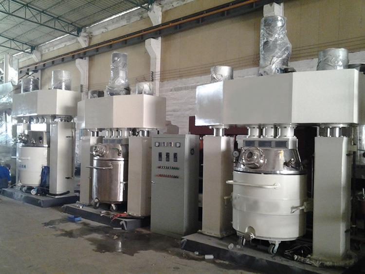采用变频调速,可满足各种工艺要求。分散机釜内有三根不同形式的搅拌器,其中一个搅拌器在绕釜体轴线转动,其余两个搅拌装置又以不同的转速绕自身轴线高速自转,使物料在釜内作复杂的运动,受到强烈的剪切和搓合。设备内山形刮片绕釜体轴线转动,将粘在壁上和底部的原料刮出参与混合,使其效果更为理想。设备密封性好,可抽真空,具有良好的排气除泡效果。