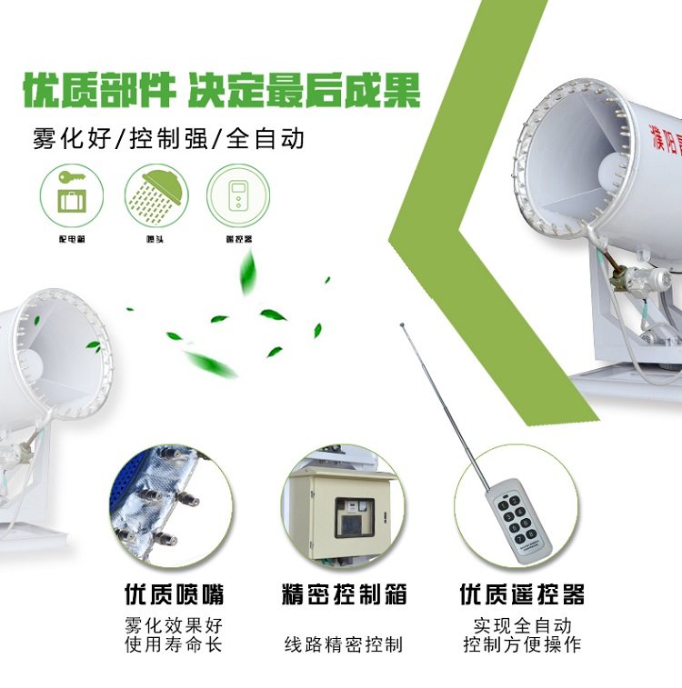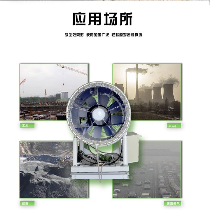 在煤炭行业、矿山现场、钢铁冶炼厂等地,风送式雾炮机能够通过水雾来降低周围环境的粉尘浓度,改善周边空气质量,风送式雾炮机喷出的水雾直径很小,但水雾的密度很大,遇到粉尘能够快速吸附,在短时间内抑制到地面,并且雾炮机喷出的水雾,还能够保证周围环境的湿度,避免粉尘随风飘动,扩大污染范围。