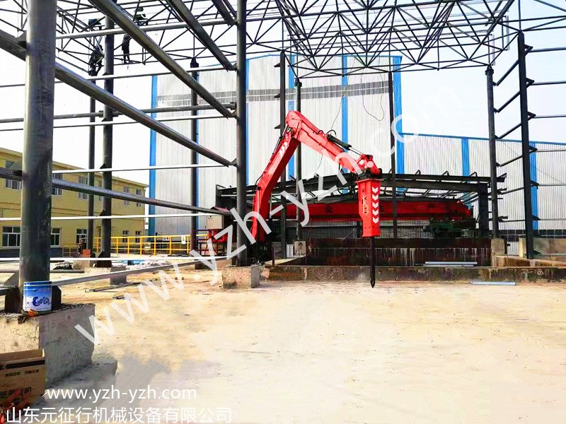 ⑩转锤油缸,尾部铰接在二臂上,活塞杆头部通过连杆同液压锤铰接。并可带动液压锤绕二臂头部铰接点回转。由于运动需要,在二臂与连杆之间装有曲柄。