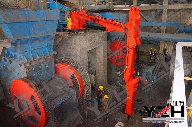 在砂石行业破碎生产线上,颚式破碎机、旋回破碎机和移动式破碎站是常用设备,这些设备的使用大大提高了砂石破碎的效率,但在生产的过程中也会出现入料口大块砂石的堵塞问题,严重影响进料。如颚式破碎机的进料口,经常会被大块物料阻塞,影响生产效率,旋回破碎机入料口、移动式破碎站入料口也都存在同样的问题,使用多功能液压碎石机械工作手臂进行二次破碎,有效促进了砂石企业的高效运作和提高了砂石生产线的机械化、自动化水平。如图1所示的为工程机械手在颚式破碎机入料口破碎作业的方案图,图2为工程机械手在旋回破碎机入料口破碎作业的方案图,图3为工程机械手在移动式破碎站入料口破碎作业的方案图。