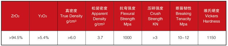 特点: 比重高、产品圆度好、规格尺寸误差小,表面光滑、 耐冲击、磨耗低、韧性好等特点。是研磨纳米材料的理想选择之一。