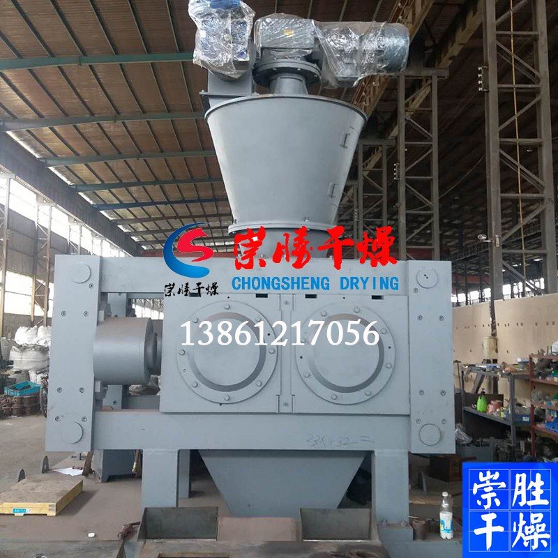 原料经定量加料器均匀送入喂料斗, 压实机利用带有穴眼孔的成对轧辊,彼此留有一定间隙,两者以相同的转速作反向旋转。其中一组轧辊轴承座在机架内不动,而另一组轧辊轴承座则在机架导轨上游动,藉助液压缸施压使彼此紧靠。轧辊表面上有规则地排列许多形状、大小相同的穴眼孔,且波谷对准波谷。而此时干粉状物料从两轧辊上方连续均匀地靠自重及强制喂料进入两轧辊之间,物料先作自由流动,进入咬入区后被轧辊逐渐咬入波谷。随着轧辊的连续旋转,物料占有的空间逐渐减少而被逐步压缩,并达到成型压力**值。随后则压力逐渐降低,所压得之型块因弹性回复加之自重而脱落穴眼孔而进入碎整粒、筛分装置,所得成品为粒状合格产品,进行过秤包装。而粉料口出来的细粉料和不合格的超大颗粒则由返料绞龙重新进入提升机加料口随同新鲜物料混合加入预加料斗而进入下一轮工艺流程。