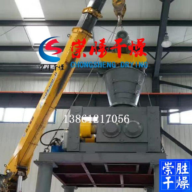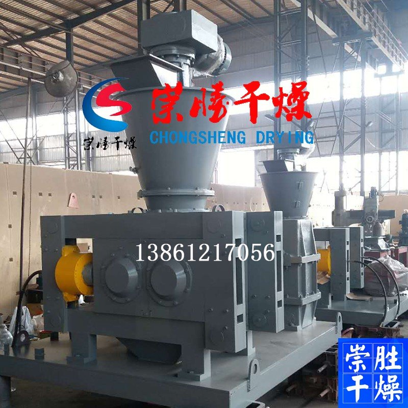 干粉通过螺旋输送机、皮带机或人工搬运进入提升机的原料仓,由斗式提升机将原料粉末送人振动式过度料仓,经过定量加料装置将物料均匀地加入变频式强制喂料机,对物料进行脱气预压缩,经预压缩的物料被压人两个相对的压辊中间进行压实,被压实的条片物料自动脱槽后进入破碎,被粉成大小不均的颗粒,然后进入双刀造粒机进行修整,修整后的颗粒通过分筛,产品颗粒经过打包或用输送机输入成品料仓,筛分下来的粉状物料经回料装置输入原料提升机,进行二次加工。