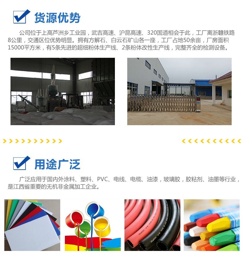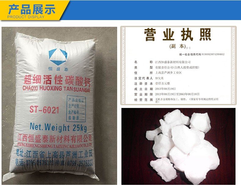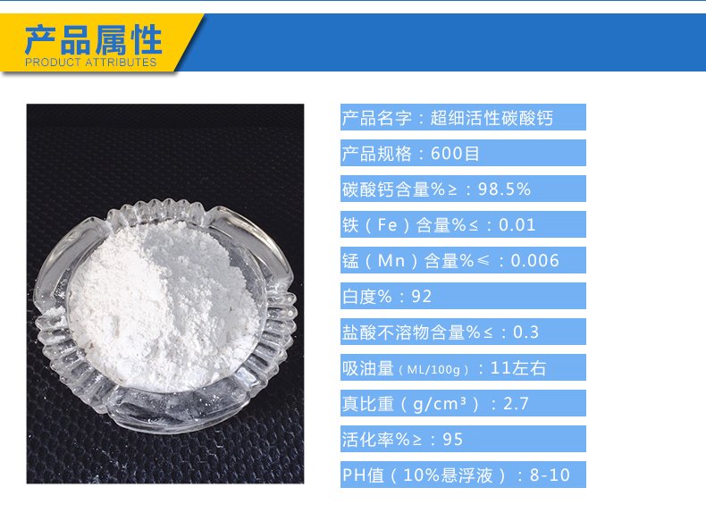 活性重质碳酸钙,该产品选用己生产好的重质碳酸钙为原料,采用粉体表面改性活化生产线,对其进行表面处理包覆而成。产品疏水、亲油、分散性流动性极好,与树脂有极好的相容性,是适用于聚合物产品的填充。