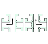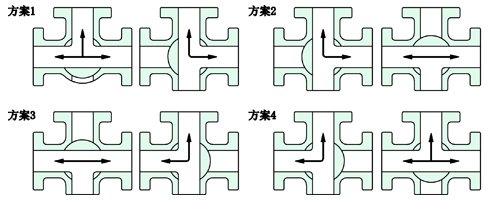 气动三通球阀分L型和T型,介质流通方向见下图。L型气动三通球阀适用于介质流向的切换,能使相互垂直的两个通道连通:T型气动三通球阀适用于介质的分流、合流或流向 切换,T型孔道可以使三个通道互相连通或使其中两个通道连通,气动三通球阀一般采用三个阀座结构,亦可根据用户要求采用四阀座结构。