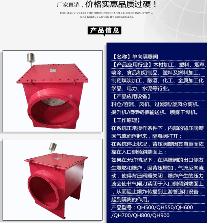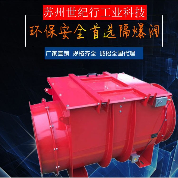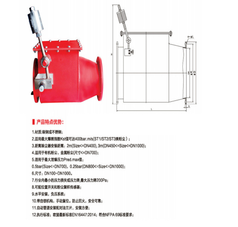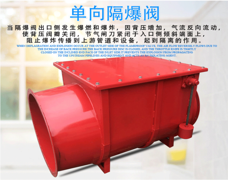 料仓粉尘隔爆阀防爆装置是一种经济实用性的被动式粉尘隔爆装置,现已得到广泛应用。粉尘隔爆阀主要设计安装于被保护设备(如:除尘器、料仓等)入口管道上,当被保护设备发生粉尘暴炸时,阻止被保护设备内粉尘暴炸产生的压力波和火焰沿相连接管道的传播,避免在相连接管道内、或由暴炸火焰和压力波传播到室内建筑或其他设备,引起破坏性的“二次暴炸”或“多次暴炸”的发生。