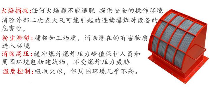 在环保检查越来越严的今-天工业安全越来越引起人们的重视,在以往人们常采用在除尘器上安装泄暴板(防爆板)来泄放除尘器内因粉尘暴炸产生额超压,减少除尘器暴炸的可能性。但当除尘器或粉尘收集器发生粉尘暴炸时,在正常的暴炸泄压中,火焰是自由泄放的。可当设备安装于室内时,自由泄放的暴炸火焰及冲击波,可能会引起二次暴炸,造成更大的损失。因此安装无焰泄放装置于室内是非常必要的,无焰泄放装置用于保护人员和设备免受粉尘暴炸破坏。在发生粉尘暴炸时,暴炸产生的火焰通过装置的灭焰装置而被熄灭,因暴炸产生的压力波也被排出,从而保-证人员和设备的安全。无焰泄放阻火器装置