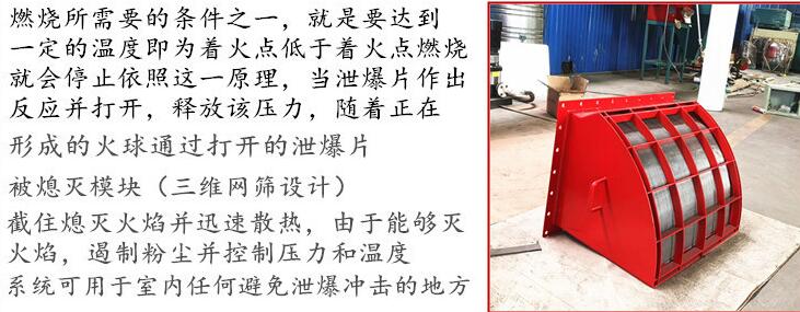 粉体防爆泄压产品:泄暴片(平板型和正拱型)、无焰泄放装置、暴炸换向阀、暴炸隔爆阀、火花探测及熄灭装置等。