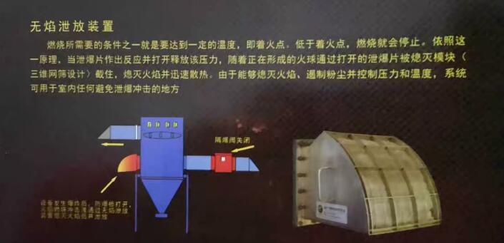 无焰泄放装置广泛的应用在粮食、冶金、化工、电力、轻工、制药、烟草、机械加工、固体废弃物处理等行业领域。应用的设备有旋风分离器、布袋除尘器、粉尘收集器、滤筒过滤器、气力输送、棒式或球磨机、斗式提升机、干燥和烘箱、辊轧研磨、建筑物等。该装置主要由泄暴板和灭焰网组成,装置安装在被保护的设备上,正常运行时,泄暴板处于密闭状态,一旦装置内发生粉尘暴炸,暴炸的超压作用在泄暴板上的作用力超过泄暴板的开启压力,泄暴板会沿着缝口破裂并开启,暴炸压力会从阻火网的缝隙中泄出,而火焰由灭焰层的“猝息”作用猝灭,以防止暴炸压力及火焰产生的高温对周围人员或设备造成危害,其结构通常是在泄暴板的基础上附加阻火网而成。