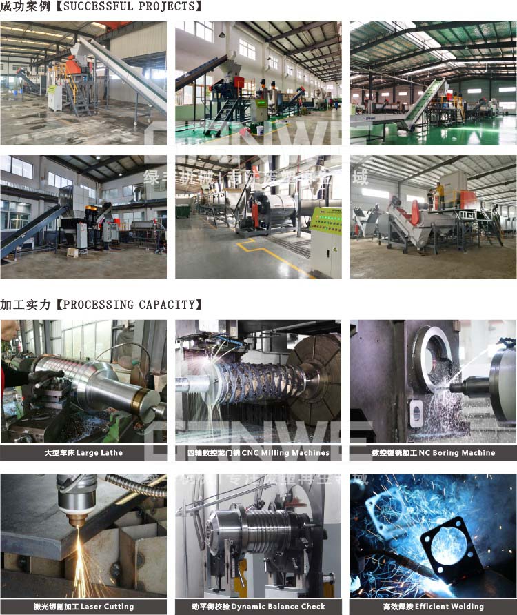 GWCRH系列粉碎机是绿丰机械针对PET瓶砖、牛奶瓶瓶砖等压缩瓶、罐类塑料而研发设计的粉碎设备。主要用于大型PET长丝级瓶片清洗线配套或大产能撕碎机后端的细碎配套之用。针对PET瓶砖料结合成品片径尺寸的不同需求,GWCRH系列粉碎机单机产能从2000kg/h至5000kg/每小时不等。GWCRH系列粉碎机粉碎室主体及主轴等部分均采用四轴CNC加工中心一体成型加工工艺,整机焊接比例不足20%,在刀片磨损允许范围内,单机可支持7×24小时不停机连续作业,且性能持久稳定。