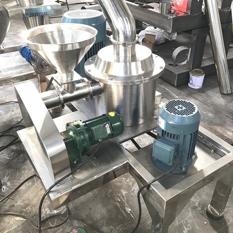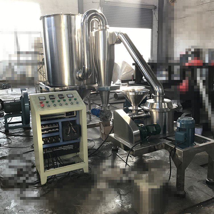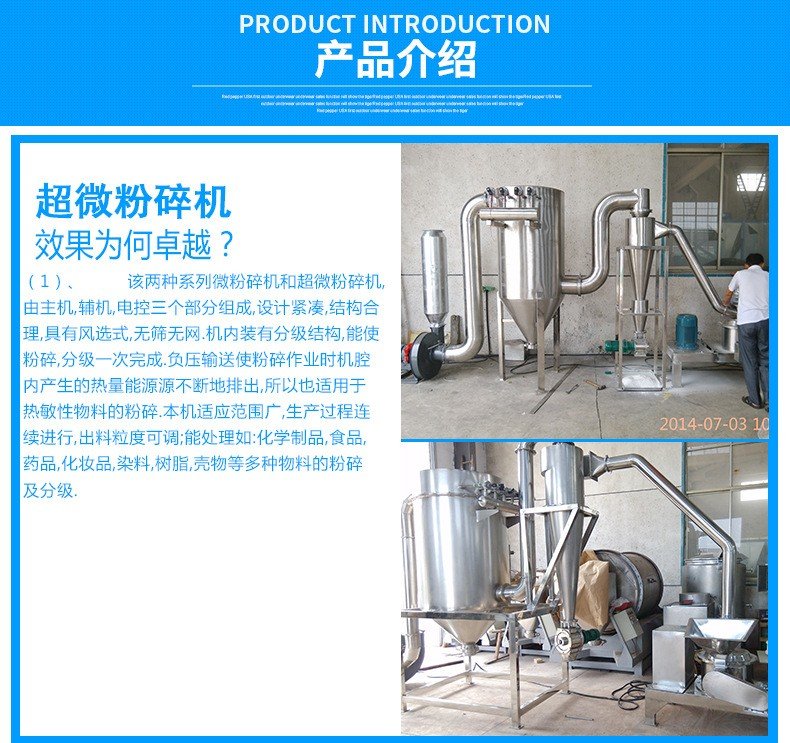 超微粉碎机是利用空气分离、重压研磨、剪切的形式来实现干性物料超微粉碎的设备。它由柱形粉碎室、研磨轮、研磨轨、风机、物料收集系统等组成。物料通过投料口进入柱形粉碎室,被沿着研磨轨做圆周运动的研磨轮碾压、剪切而实现粉碎。被粉碎的物料通过风机引起的负压气流带出粉碎室,进入物料收集系统,经过滤袋过滤,空气被排出,物料、粉尘被收集,完成粉碎。