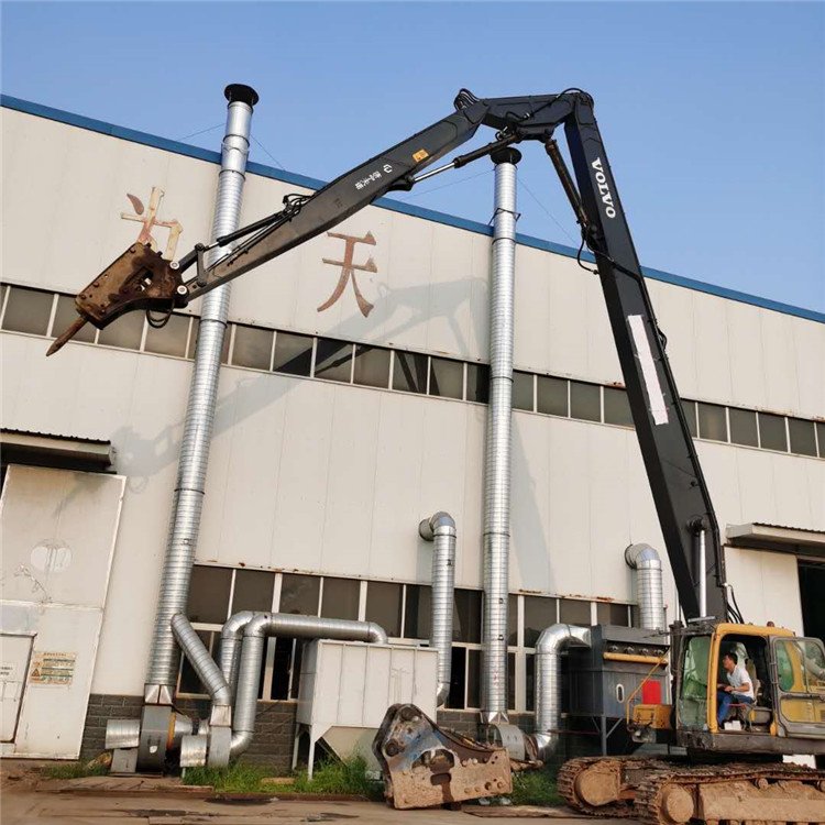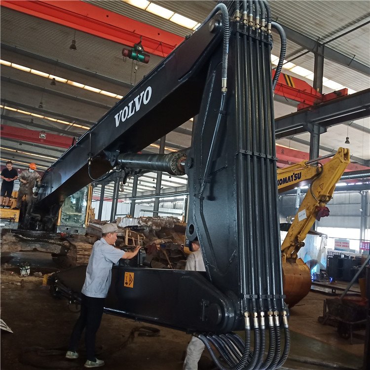 加长臂是为拖长挖掘机工作范围根据工况要求而设计制造的挖掘机前端工作装置。按其作业方式分为:拆楼式加长臂,深坑式加长臂,打桩式加长臂;按其段数分为:二段式加长臂,三段式加长臂,四段式加长臂;按其性能分为:固定式加长臂,滑移式加长臂,伸缩式加长臂等。