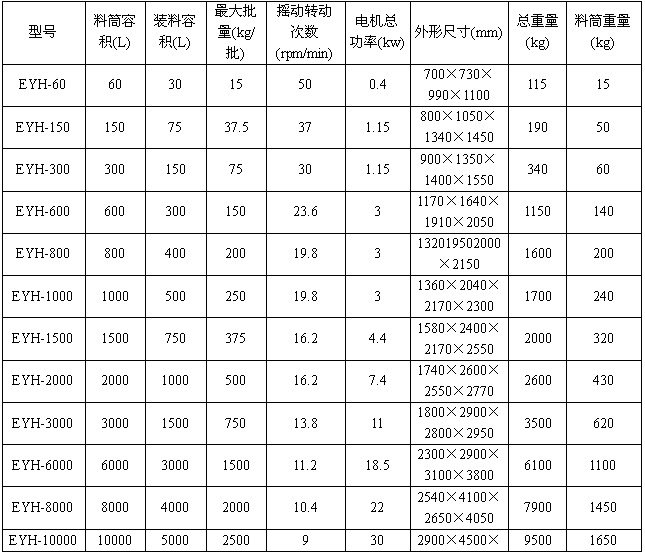 EYH型双臂传动二维运动混合机主要由转筒、摆动架、机架三大部分构成。转筒装在摆动架上,由四个滚轮支撑并由两个挡轮对其进行轴向定位。在四个支撑滚轮中,其中两个传动轮由转动动力系统拖动使转筒产生转动,摆动架由一组曲柄摆杆机构来驱动,曲柄摆杆机构装在机架上,摆动架由轴承组件支撑在机架上。EYH型二维运动混合机广泛用于医药、化工、食品、染料、饲料、化肥、农药等行业尤其适用于大吨位(1000L~10000L)各种粉、粒状物料的混合。