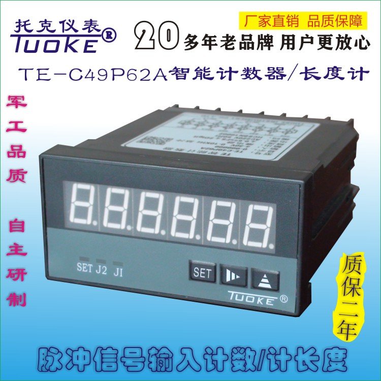 五、面板说明1、位选键():当进入编程状态时,数码管中有一位闪烁,通过此键可使闪烁位从高位向低位循环移动2、增加键(Δ):当进入编程状态时,通过此键可使闪烁位的数字由0到9循环增加。3、复位键(RST):在正常工作时,按下复位键,计数器恢复初始状态,抬起复位键,计数器开始计数。4、功能键(SET):在正常工作时,编程灯(SET)不亮,此时按一下功能键,编程灯亮,表示进入编程状态。六、 操作指南1、TE-□48P41B、TE-□49P41B、TE-□72P41B、TE-□94P41B使用说明:1)、显示器:正常工作时,上边四位数码管显示当前计数值。下边四位数码管显示设定值。2)、计数值设定:利用增加键和位选键即可任意设定计数器的计数值、倍率值。**次按位选键(),上边**位数码管呈闪烁状态,按增加键(△),设定此数值;再按位选键(),上边第二位数码管闪烁,按增加键(△),设定此数值;依次类推,设定第三位、第四位数值,即设定了四位计数值;此时再按位选键(),下边**位数码管呈闪烁状态,按增加键(△),设定此数值;然后按位选键(),下边第二位数码管闪烁,按增加键(△),设定此数值;依次类推,设定下边第三位、第四位数值,即设定了计数器的倍率值(显示值等于计数脉冲数乘以倍率,倍率值范围:0.001-9.999);这时数码管仍在闪烁,8秒种后,闪烁停止,以上所设定的计数值、倍率值便自动存入机内。注意:在整个设定过程中,应连续进行,每两步骤之间不应超过8秒钟。3)、接线端子说明:①、GND为公共端,PAU为计数选择端,计数选择端PAU与公共端GND相接,计数为倒计数,反之为正计数.②、RST为计数复位端,RST端与GND端接通,计数器恢复初始状态;RST端GND端断开,计数器从初始值开始计数。③、INPUT为计数输入端,开关量、电平脉冲两种输入信号兼容。开关量如常开触点、光电对管。电平脉冲:低电平:-30V—+0.6V;高电平:+4V—+30V。(见图1)2、TE-□48P81B、TE-□49P81B、TE-□72P81B、TE-□94P81B使用说明:1)、显示器:正常工作时,八位数码管显示当前计数值。2)、计数值设定:利用增加键和位选键即可任意设定计数器的计数值、倍率值。 先按位选键(),上边**位数码管呈闪烁状态,按增加键(△),设定此数值;再按位选键(),上边第二位数码管闪烁,按增加键(△),设定此数值;依次类推,设定上边第三位、第四位数值,下边**位、第二位、第三位、第四位数值,即设定了计数器的计数值,再按位选键(),只有上边四位数码管亮,且**位数码管闪烁,按增加键(△),设定此数值,再按位选键(),上边第二位数码管闪烁,按增加键(△),设定此数值,依次类推,设定上边第三位、第四位数值,即设定了计数器的倍率值(显示值等于计数脉冲数乘以倍率,倍率值范围:0.001-9.999);这时数码管仍在闪烁,8秒种后,闪烁停止,以上所设定的计数值、倍率值便自动存入机内。3)、接线端子说明:①、GND为公共端,PAU为计数选择端,计数选择端PAU与公共端GND相接,计数为倒计数,反之为正计数. ②、RST为计数复位端,RST端与GND端接通,计数器恢复初始状态;RST端GND端断开,计数器从初始值开始计数 ③、INPUT为计数输入端,开关量、电平脉冲两种输入信号兼容。开关量如常开触点、光电对管。电平脉冲:低电平:-30V—+0.6V;高电平:+4V—+30V。(见图1)3、TE-□49P62A(六位智能数显计数器/长度计)使用说明1)、功能键(SET):按动此键将按如下顺序选项①在正常工作时,编程灯(SET)不亮,此时按一下功能键,编程灯亮,表示进入编程状态。同时继电器1指示灯(J1)亮,这时可通过位选和增加键,设置继电器1的动作值(当显示值大于或等于该值时继电器1吸合,否则释放)。 ②再按动功能键,J1灯灭,继电器2指示灯(J2)亮,此时可设定继电器2的动作值(当显示值大于或等于该值时继电器2吸合,否则释放)。 |