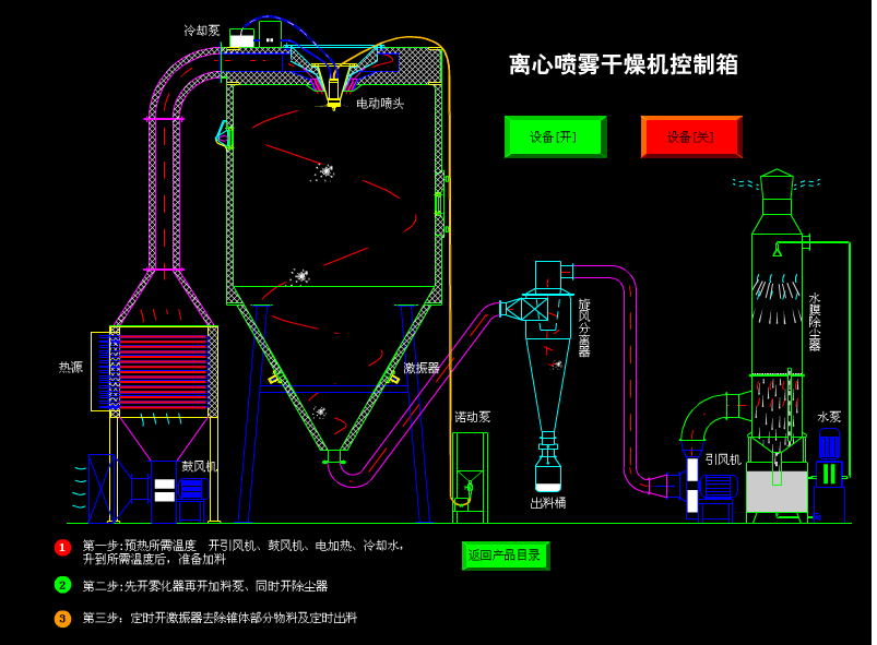 空气经过过滤和加热,进入干燥器顶部空气分配器,热空气呈螺旋状均匀地进入干燥室。料液经塔体顶部的高速离心雾化器,(旋转)喷雾成极细微的雾状液珠,与热空气并流接触,在极短的时间内可干燥为成品。成品连续地由干燥塔底部和旋风分离器中输出,废气由风机排空。