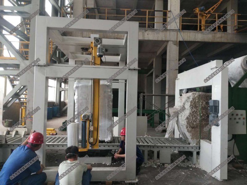 侧面缠绕继续缠绕,顶部处缠绕两圈后开始向下缠绕(加强顶部缠绕强度),下降缠绕至产品根部,断开缠绕膜,回到初始位置等待下一道工序。