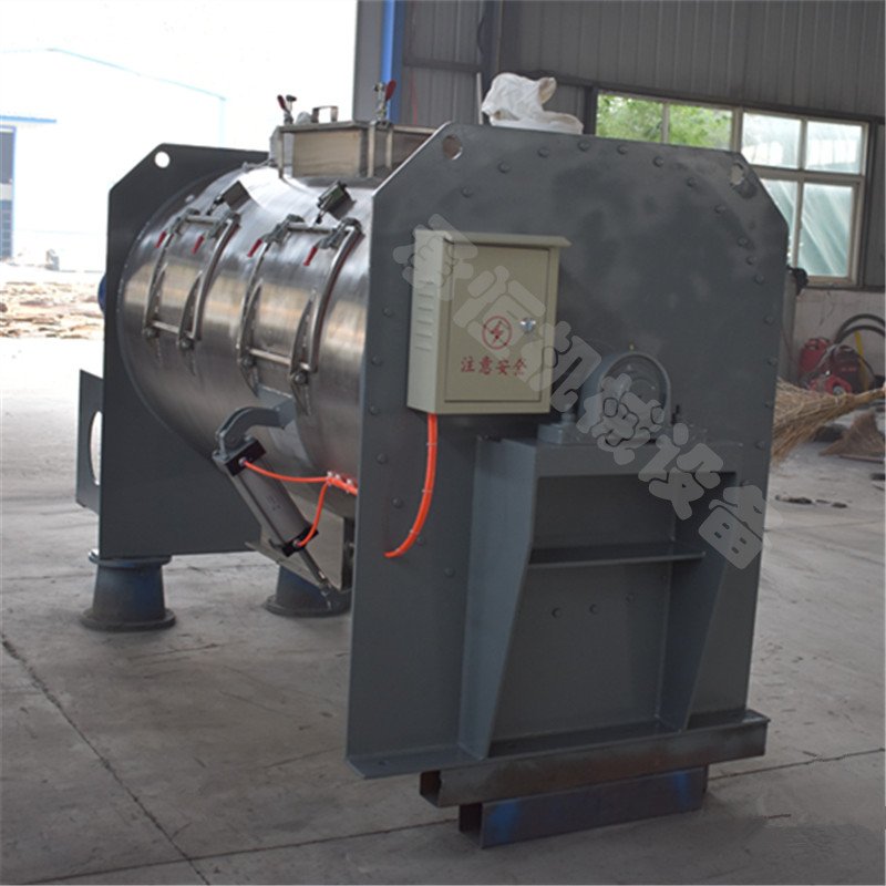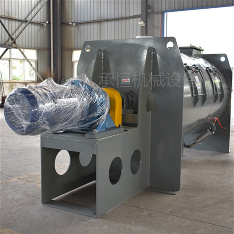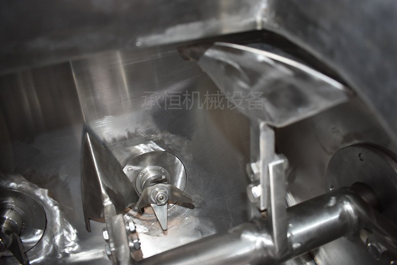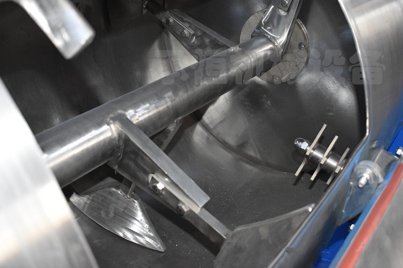 犁刀混合机由卧式圆柱形筒体、安装有犁头搅拌器的单轴、高速飞刀、顶部开口、底部支腿以及传动单元组成。犁刀头搅拌器旋转以带动物料做径向运动;高速飞刀打散物料;物料在犁头搅拌器和高速飞刀的作用下得到均匀混合。
