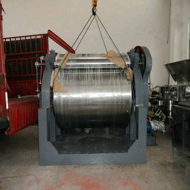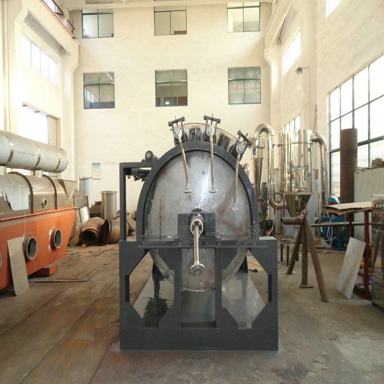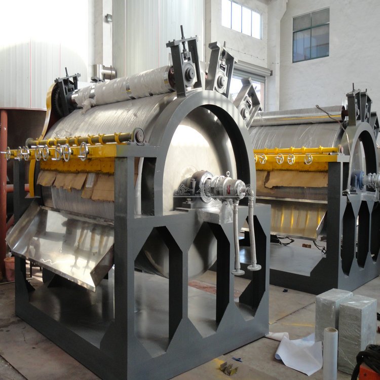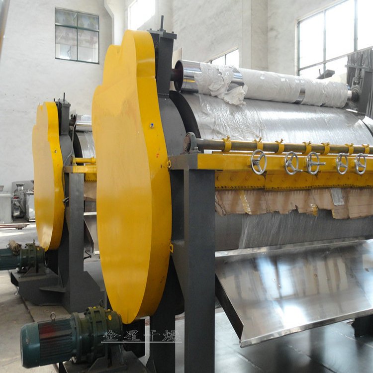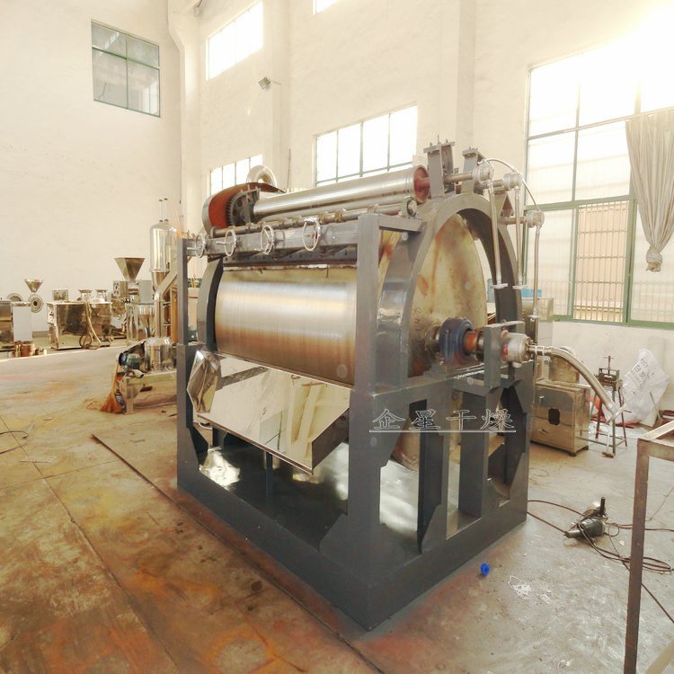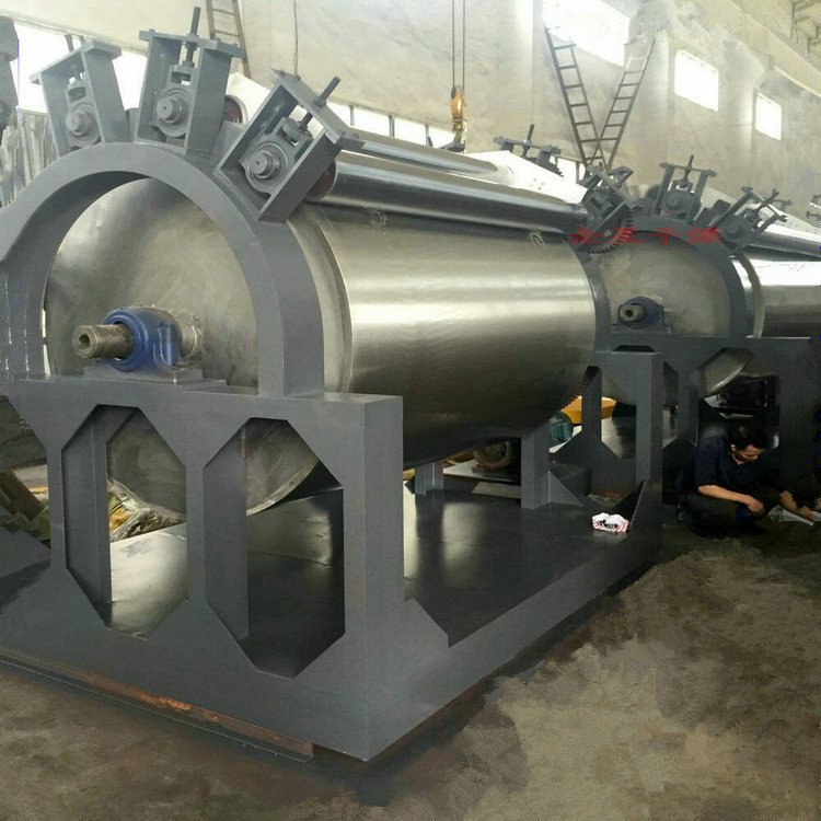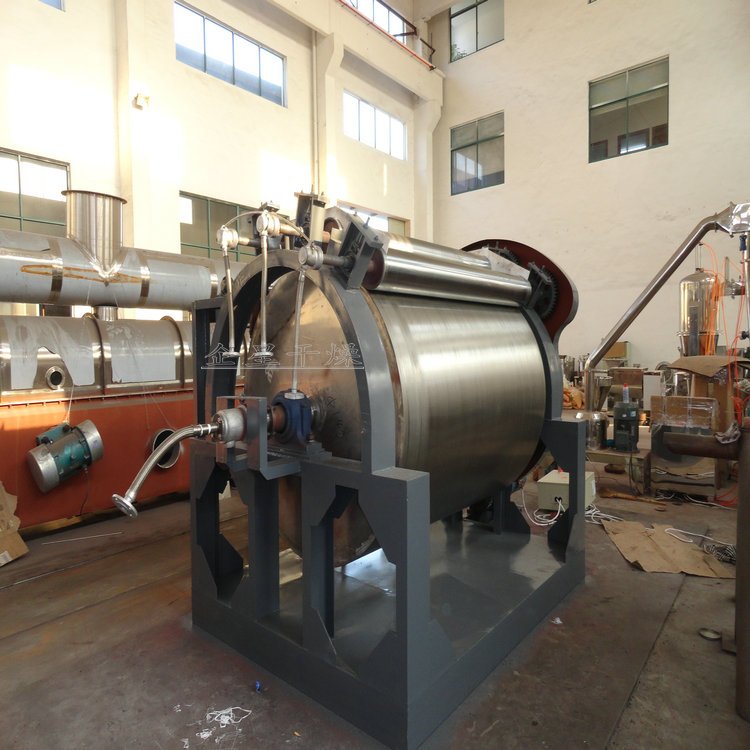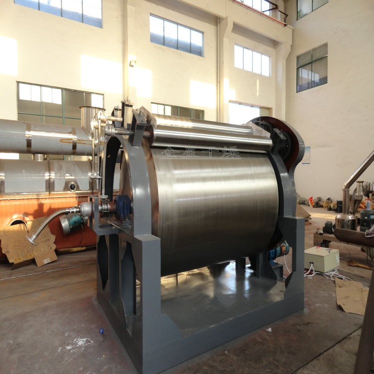 HG系列滚筒刮板干燥机 工作原理 滚筒干燥机是一种内加热传导型转动连续干燥设备。旋转的滚筒通过其下部料槽,粘附着一厚度的料膜,热量通过管道输送至滚筒内壁,传导到滚筒外壁,再传导给料膜,使料膜中的湿得到蒸发、脱湿、使含湿分的物料得到干燥。干燥好的物料被装置在滚筒表面的刮刀铲离滚筒,到置于刮刀下方的螺旋输送器,通过螺旋输送器将干物料集中、包装。 性能特点 热效率高,因滚筒干燥机传热机理属热传导,传热方向在整个操作周期中保持一致,除盖散热和热辐射损失外,其余热量全部都用于筒料膜湿分的蒸发上,热效率可达70-80。操作弹性大,适用性广。可调整滚筒干燥机的诸多干燥因素。如进料的浓度、涂料料膜的厚度、加热介质的温度、滚筒的转动速度等,都可以改变滚筒干燥机的干燥效率,且诸多因素互无牵连。这给滚筒干燥操作带来很大的方便,使之能适应多种物料的干燥和不同产量的要求。干燥时间短。物料的干燥周期一般只有10-300秒,在适合于热敏性物料。若将滚筒干燥机设置在真空器中,则可在减压条件下运行。干燥速率大。由于涂料抹于筒壁的料膜很薄,一般在0.3-1.5mm,且传热、传质方向一致,料膜表面可保持20-70kg.H2O/m2.h的蒸发强。 安装 本机安装系根据总图布置安装,地面要平整,蒸气管进口处要装压力表及安全阀,各蒸气进口法兰连接牢固。 适应物料 适用于化工、染料、制药、食品、冶金等行业液体或较粘稠物料的干燥。 维护 定期检查旋转部件转动灵活性,是否有卡阻现象。链轮等部件要定期加上润滑脂,定期校正压力表等计量器件误差。对三角带传动件有磨损严重现象应及时更换。电动机、减速机维护详见电动机、减速机使用维护说明书。 调试 本机安装后要先进行试运转实验点动主电机观察主滚筒转向正确。 观察主滚筒及各传部件转动是否灵活,观察蒸气进出口是否接通,压力表是否在工作压力范围内。 启动电机,主滚筒动运转平稳,温度升高后加入物料后调整电机转速及物料在滚筒上薄膜均匀程度来控制物料终含水量。 启动绞龙电机,输出干燥成品物料,根据干燥成品量调整绞龙电机转速。 |