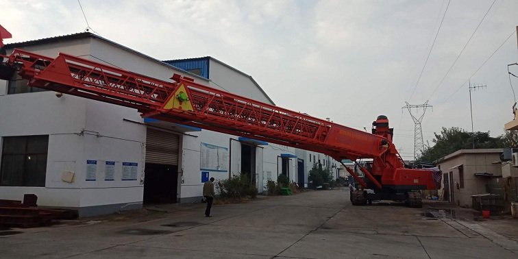 该型布料机主要通过液压履带式配重机底盘系统总成液压动力系统输出的动作,使该整机系统可靠的完成自由行走、转场,布料臂架仰、俯变幅,布料臂架360°回转驱动等动作。布料臂架伸缩和皮带机驱动动作的源动力,采用底盘自带液压系统驱动(也可以采用外接380V电源驱动)。布料伸缩臂架式皮带机为可伸缩的高速皮带机,由三节桁架组成,*长伸幅为42米,仰角**时水平长度*短为18米。