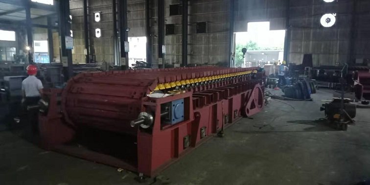 2)经过浮选机进行浮选的金矿粉料,加入了浮选药剂,物料湿度较大,有粘性,同时有可能结成块状。由于物料的特殊性这道工序的配套输送设备比较关键:料斗一次抓料十多吨,物料对输送机有较大的冲击力。所以这道工序选择的输送机要能承受物料冲击,也要能输送粘性物料,同时该输送机具有打散功能,把结成块的物料打散。这道工序的输送机通常采用我公司研制的新型皮带板式给料机,可满足以上要求。