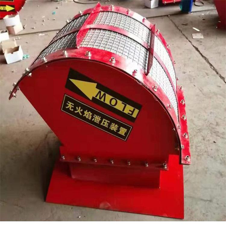 无焰泄放装置是由火焰熄灭模板,泄爆片,防 爆接线盒和夹持器组成。可安装于室内除尘箱体。泄爆片有信号装置,可以通过接线盒与风机或者其他设备联动。当发生粉尘爆开时, 泄爆片对快速冲击的爆燃压力做出反应,并打开,以释放压力,火焰在通过网状阻火元件时,阻火元件与火焰进行热交换,迅速将高温火焰冷却,泄放压力和烟气,保-证火焰不被传播,进而造成二次暴炸或多次暴炸,同时,生产设备产生的压力波或噪音也会降低程度。工业生产中,无焰泄暴装置与隔爆阀的组合使用不但有效防止压力波和火焰传播到上游车间的生产场地,而且遏制了二次暴炸事故的发生,降低了财产损失和保护了人员安全。