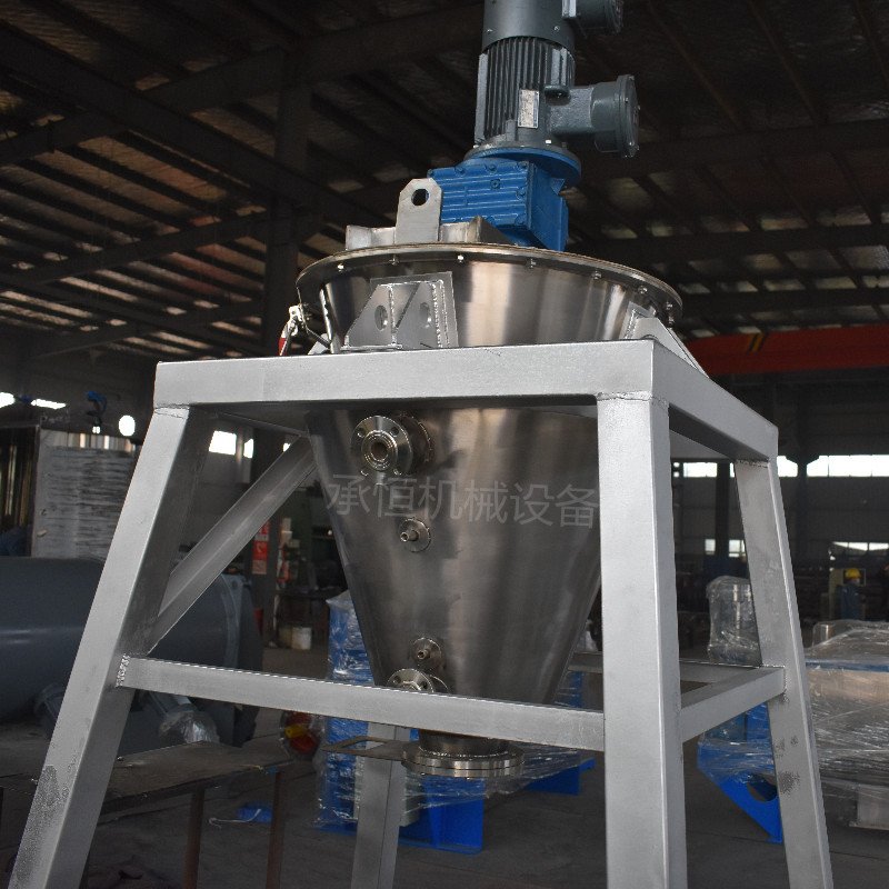 我公司引进国外设计技术研制的锥形双螺旋混合机,搅拌部件为一条长螺旋或两条不对称螺旋;它们在绕自己的轴线转动(自转)的同时,还借助悬臂的转动环绕锥形容器的中心轴沿锥形容器的内壁做行星运动(公转);该设备通过螺旋的公、自转使物料反复提升,在锥体内产生剪切、对流、扩散等复合运动,从而达到混合均匀的目的。经过多年改进,在颜料、染料、化工等行业经过多年实际应用,具有良好的节能及三重混合效果。