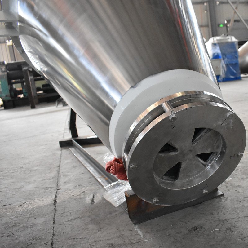 锥形混合机由立式锥形筒体、单/双/三根非对称螺旋轴、转臂、传动、固定或全开式顶盖组成。单/双/三根轴围绕各自的轴线旋转,称为自转;转臂驱使单/双/三根轴沿着筒壁旋转,称为公转。自转提升物料;公转使物料做径向运动。自转提升的物料形成一/二/三股物料流,物料流下降填补底部空缺区域。因此,物料在三维复合运动下得到均匀混合。