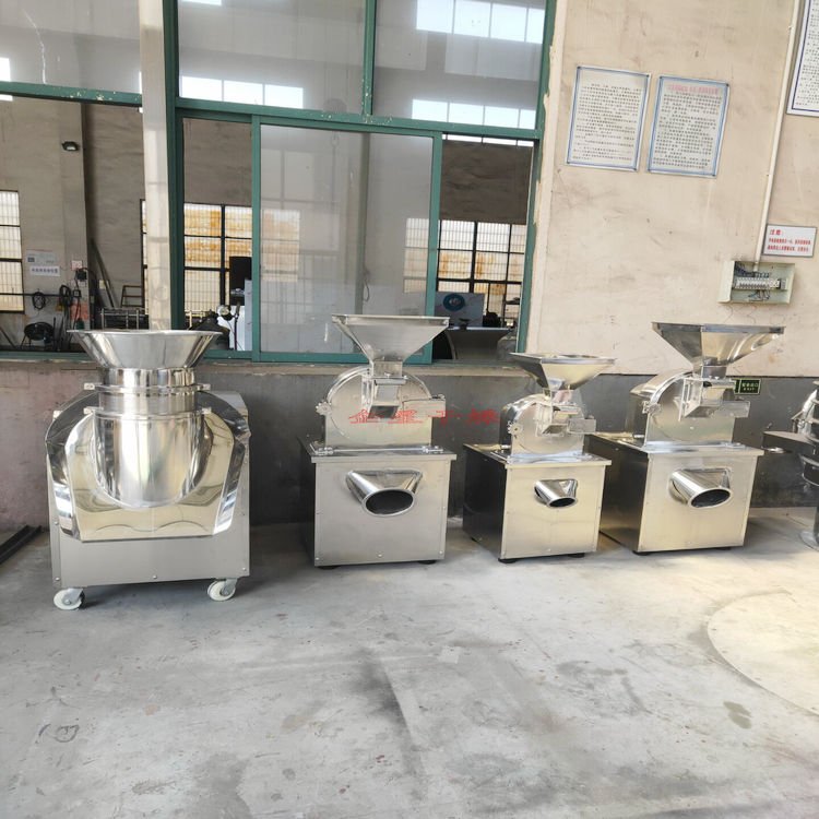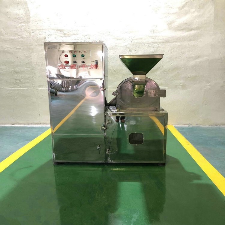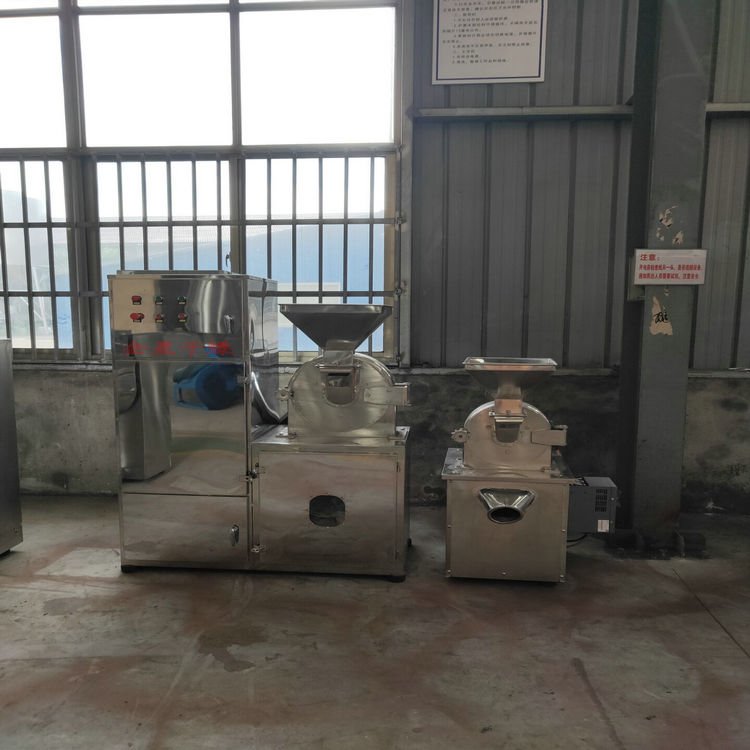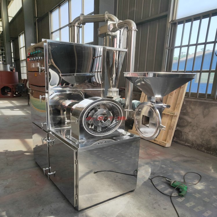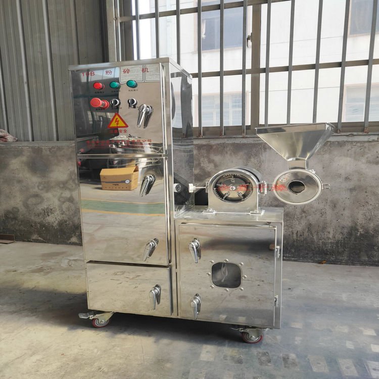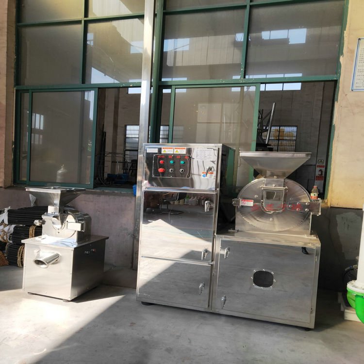 粉碎机系采用优质304号不锈钢制作,配套国标电机,主要用于化工材料、中药材含树根、树枝以及块状类物料、各种含油量不高的粮食、五谷杂粮以及其他一些硬性、脆性的物料。本机利用活动齿盘和固定齿盘间的相对高速运转,使被粉碎物经齿盘冲击、摩擦及物料彼此间碰撞而获得粉碎。粉碎物可直接从磨腔中排出,经出料口出来,一般的物料经过粉碎后要经过棉布袋来收集,粉碎后的物料收集在袋内,空气则从布袋的细小孔眼出来,不会将细粉排出,从而起到不浪费,不污染的效果。粒度大小由更换不同目数的筛网决定。本机结构简洁、坚固,运转平稳,粉碎物料快速、均匀,效果良好。本机全为不锈钢材料制作,机壳内部(粉碎槽)所有齿槽经精密机加工从而达到表面平滑,易于清理,改变了普通粉碎机内壁粗糙、易积粉、难清理的现象,使食品、药品、化工等生产更能符合国家标准,达到GMP的卫生要求。