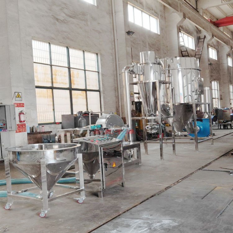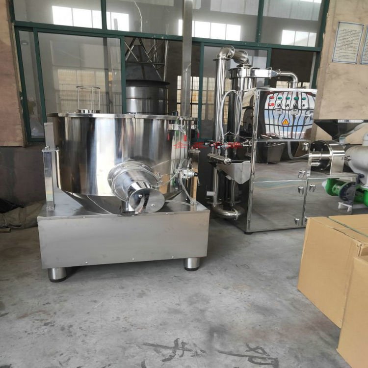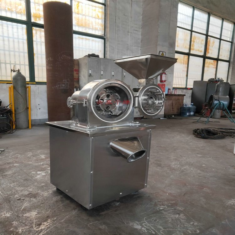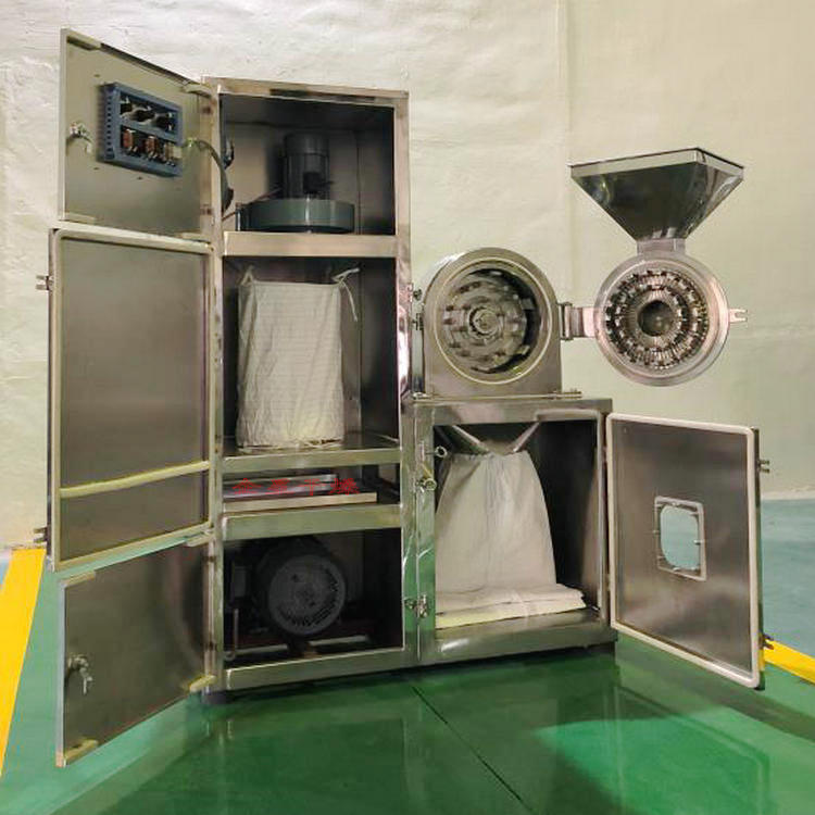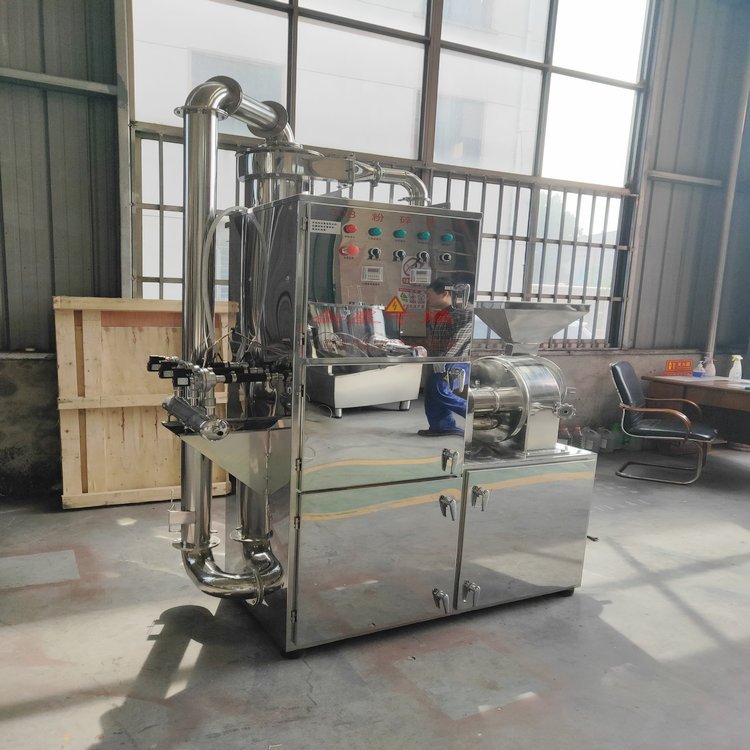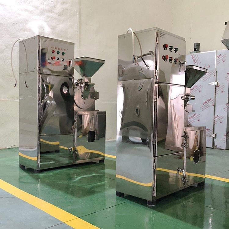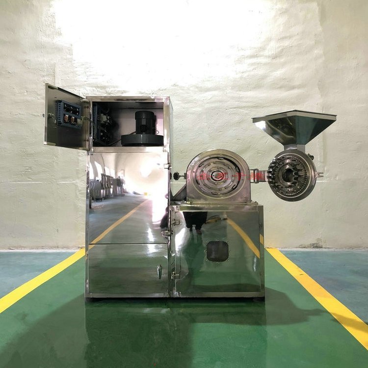 粉碎机系采用优质304号不锈钢制作,配套国标电机,主要用于化工材料、中药材含树根、树枝以及块状类物料、各种含油量不高的粮食、五谷杂粮以及其他一些硬性、脆性的物料。本机利用活动齿盘和固定齿盘间的相对高速运转,使被粉碎物经齿盘冲击、摩擦及物料彼此间碰撞而获得粉碎。粉碎物可直接从磨腔中排出,经出料口出来,一般的物料经过粉碎后要经过棉布袋来收集,粉碎后的物料收集在袋内,空气则从布袋的细小孔眼出来,不会将细粉排出,从而起到不浪费,不污染的效果。粒度大小由更换不同目数的筛网决定。本机结构简洁、坚固,运转平稳,粉碎物料快速、均匀,效果良好。本机全为不锈钢材料制作,机壳内部(粉碎槽)所有齿槽经精密机加工从而达到表面平滑,易于清理,改变了普通粉碎机内壁粗糙、易积粉、难清理的现象,使食品、药品、化工等生产更能符合国家标准,达到GMP的卫生要求。