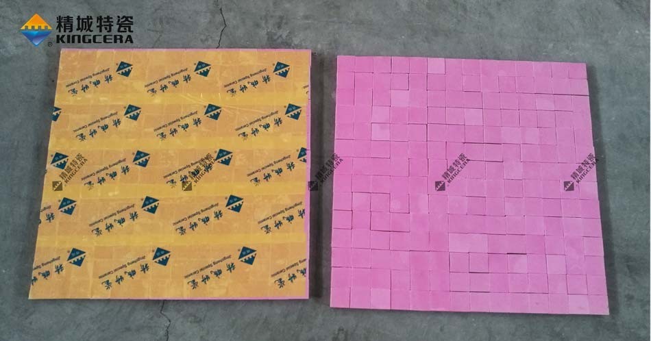 直粘型耐磨陶瓷衬板(NMC-Z)是先将耐磨陶瓷片粘贴在胶纸上,形成不同大小的陶瓷衬板。使用时再用无机耐高温粘合剂(GWJ-350)直接粘贴在设备内壁,经固化后形成牢固防磨层。