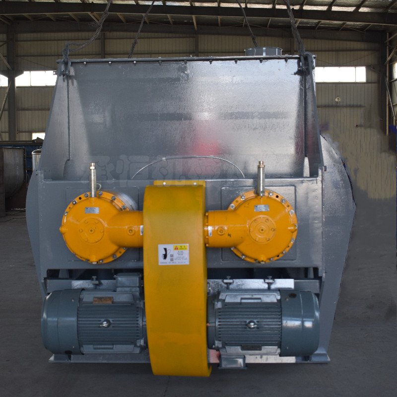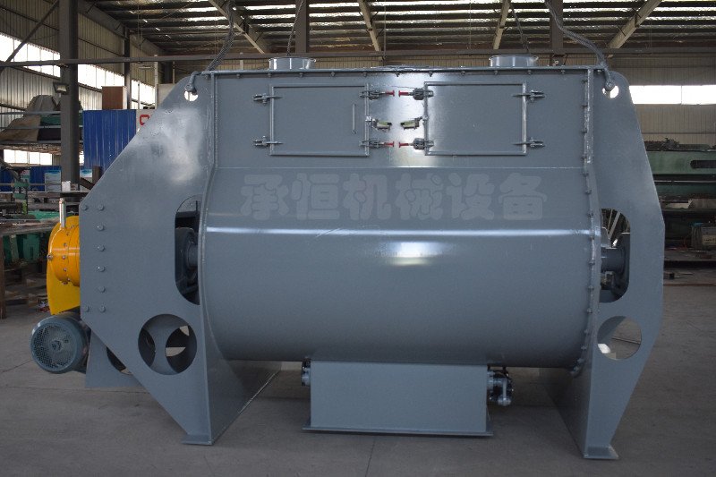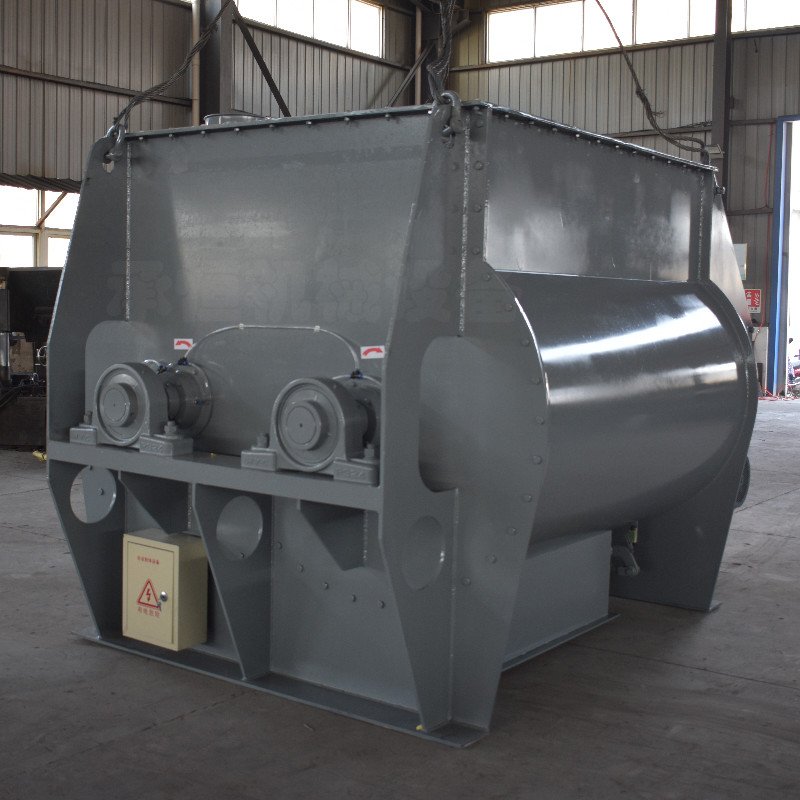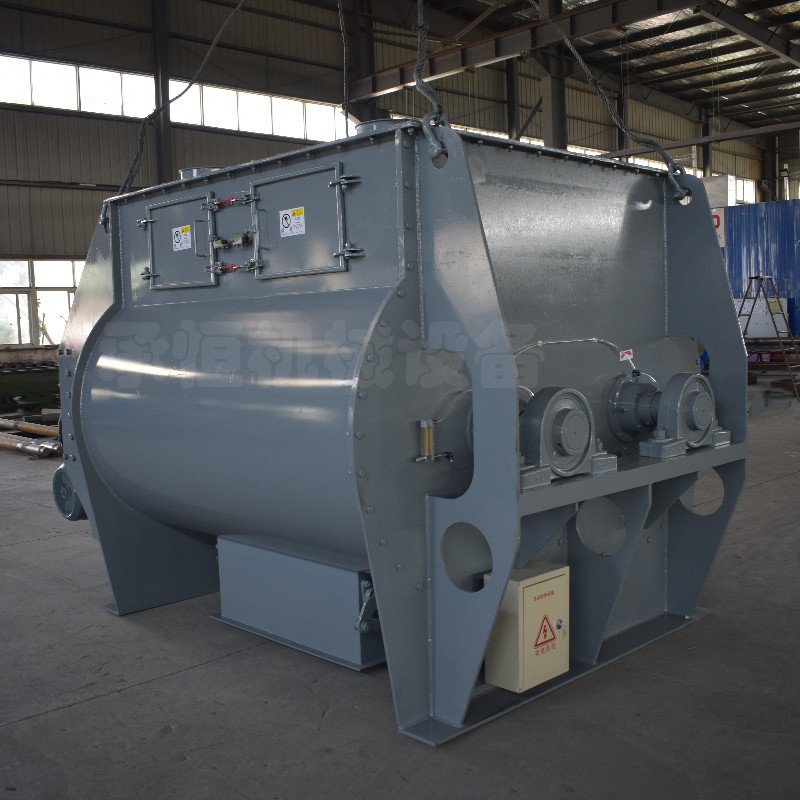 无重力混合机设备描述:混合机采用卧式W型筒体,内设两组反向旋转的平行轴,两轴上装有相反角度的浆叶(称双卧轴),运行时带动物料达到抛物线的高点使物料瞬间失重,称之为无重力点,在该点不同粒径、不同密度的物料实现均匀混合,亦称无重力双轴浆叶混合机,两侧的物料即反向运动,物料相互落入对面区域内,中间部位形成对流,从而确保物料径向、环向、轴向三向抛洒运动,形成复合循环,迅速达到均匀混合,无重力混合机设计混合时间1~3分钟,混合后由底部出料。