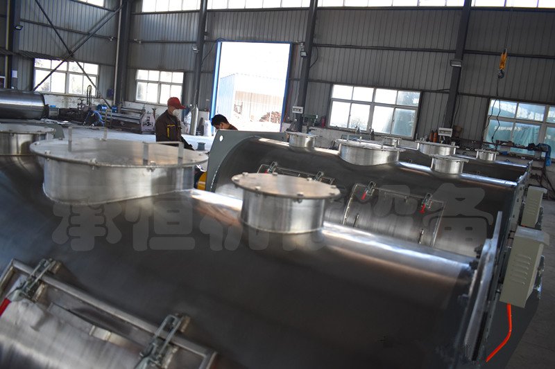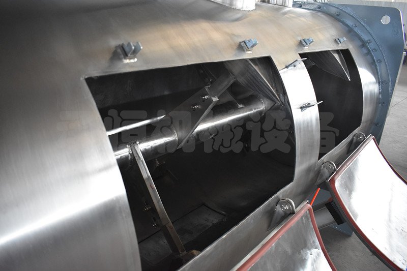 犁刀混合机内部采用曲面式刀面的犁刀,在每次转动的作用下,物料被犁刀双向刀面分成两个方向的螺旋形物料流,并与附近的犁刀作用的物料相结合。反复的且多轨迹的作用效果保证了连续式的生产方式下的混合物料的均匀性,同时又实现了自动化控制和连续不间断生产的混合工艺,可以将多种不同的物料同时加入机器一边搅拌一边输送,可以同时对各类粉体跟粉体,粉体跟液体,液体跟液体进行连续混合搅拌与输出。