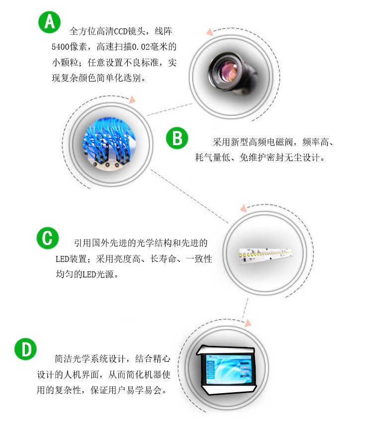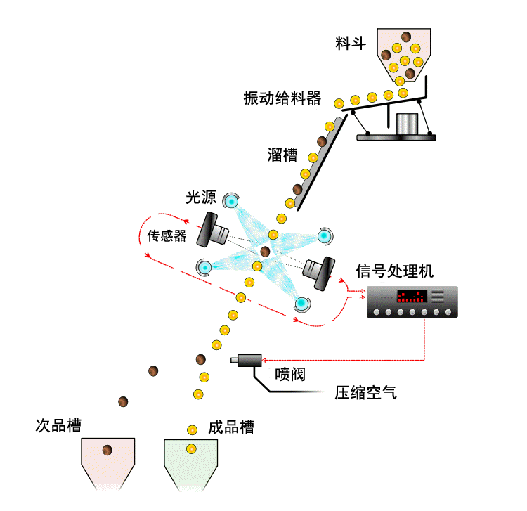 大米色选机是根据大米光学特性的差异,利用光电技术将大米中的异色颗粒自动分拣出来,从而达到提升大米品质,去除杂质的效果。
