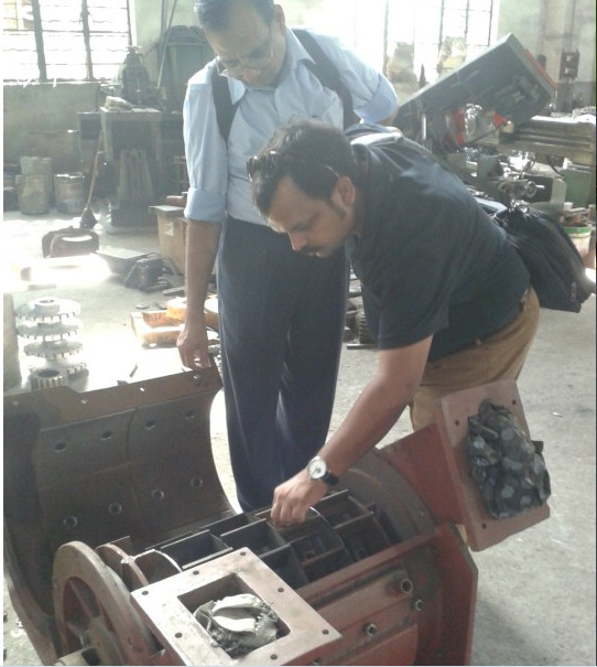 在机器内部,由4组刀盘共56把刀片组成的粉碎转子支承在左右端盖的轴承座上作高速旋转,使固体物料颗粒在内腔的齿形衬板与刀片之间受到挤压、撕裂、碰撞,剪切等多种机理作用,从而达到粉碎目的;同时转子两端的大、小叶轮的高速旋转,在进口和出口间通过腔体形式涡流效应,使被粉碎颗粒顺畅地进口(间隙大)到(间隙小),实现粉碎并细化。为限止腔内温度过高,提高粉碎效率,防止颗粒粘腔、粘刀、堵齿、结团,在腔体表面的4组宽腔体水夹套强迫水冷,使腔内温度控制在较低。