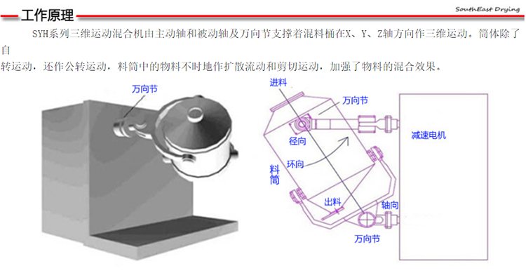 三维混合机俗称"多向运动混合机"是一种广泛应用于制药、化工、食品、轻工等行业及科研单位的新颖物料混合机。该机能非常均匀地混合流动性较好的粉状或颗粒状的物料。