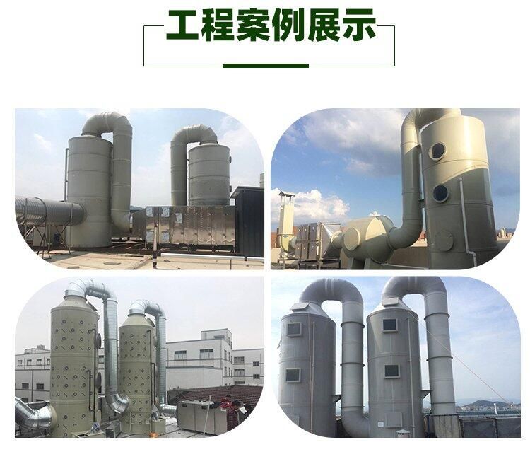 工作原理:酸雾废气由风管引入净化塔,经过填料层,废气与吸收液进液两相充分接回触吸收中和反应,酸雾废气经过净化后,再经除雾板脱水除雾后由风机排入大气。吸收液在塔底经水泵增压后在塔顶喷淋而下,回流至塔底循环使用。净化后的酸雾废气达到排放标准的排放要求,低于排放标准。