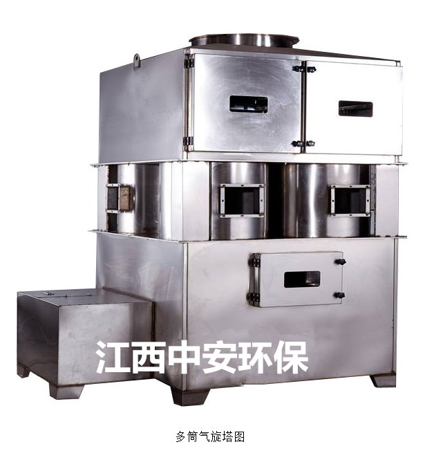 气旋塔采用流体力学技术,避免水泵及喷头的堵塞,大大提高生产效率,其中水池的水可循环使用,避免产生二次污染造成的困扰,更节约了水资源;双极气旋塔内安装有两个“圆形旋流桶”和有效除雾板。旋流桶内放有实心填料球,上层的除雾板用来净化水雾,达到脱水雾的目的,含漆气体在塔内旋流上升、并在各板上与由塔顶进入的液体旋流接触,完成除尘任务;通过离心力的作用,废气中的漆雾沉入水池, 之后由人工捞出清理机壳,这样气体得到净化,同时气旋塔内的水可以继续循环使用。