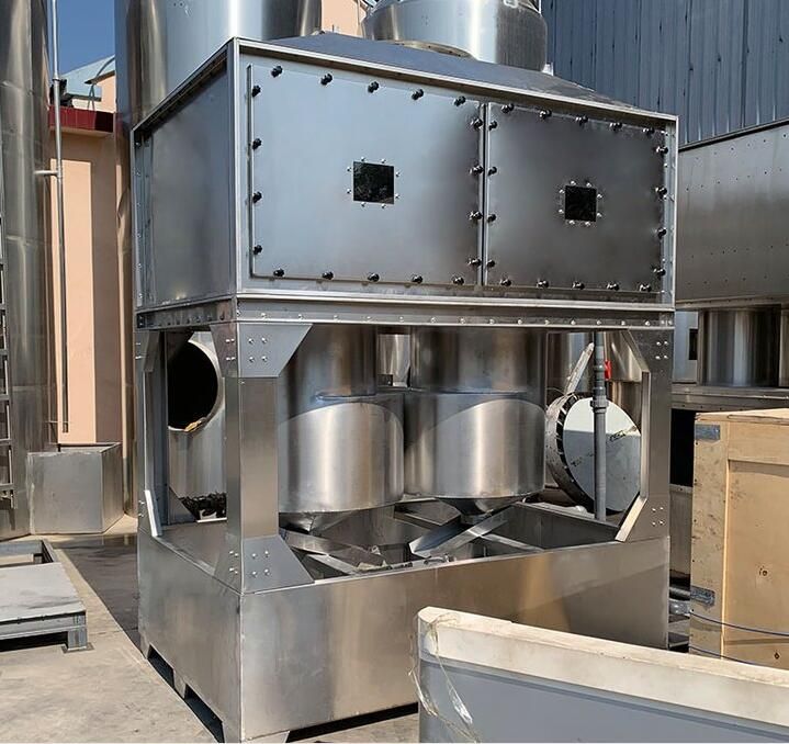 气旋喷淋塔在离心力作用下,含尘气体呈横向向心运动,含尘气体停留时间更长,洗涤效果更好,彻底改善了喷淋塔在某些特定工况下存在的除尘不彻底、水喷淋塔容易堵塞等技术缺陷。产品采用专力技术,避免水泵及喷头的堵塞,大大提高生产效率,其中水池的水可循环使用,避免产生二次污染造成的困扰,更节约了水资源。气旋塔内安装有若干个“圆形旋流桶”和高效除雾板。旋流桶内放有实心填料球,上层的除雾板用来净化水雾,达到脱水雾的目的,含尘气体在塔内旋流上升、并在各板上与由塔顶进入的液体旋流接触,完成除尘任务。