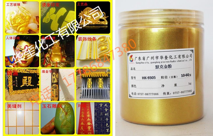 华奎化工有限公司999默克金粉它无毒无害,耐高温,耐光照,耐酸碱,不色变,不迁移,不导电等诸多优点,使其成为当代**特色及前途的新型颜料。规格: 200目 400目 800目高亮闪的999黄金粉又称金箔粉,做出产品颜色纯正,亮度高,适用于铁艺,工艺品,佛像,雕塑等工程。些效果并非普通珠光粉可比拟,可免费提供样品!金箔粉由新型合成高透明度片状晶体底材,包覆二氧化钛等金属氧化物组成,通过精密控制二氧化钛等金属氧化物的包覆厚度,产生黄金颜色一样的效果。特殊钻石珑光泽效果颜料赋予一个全新的、璀璨的、星光闪烁的、钻石般的光学维度空间及美妙的色调,这些富于情感的色彩及光泽,使终端产品的美丽、个性及品质得以充分展示。广州华奎化工珠光颜料主要包括珍珠银白色系列、金色系列、铁色系列、幻彩系列、彩色系列。珠光颜料呈粉状物,对人体无毒无害,可用于食品包装和儿童玩具;稀酸和碱不能侵蚀光颜料珠;珠光颜料对于环境无害,因为它们实际不溶于水,且不含任何重金属,属于对水质无害的等级;珠光颜料不能燃烧,也不自燃,不导电,能耐受800℃的高瘟;珠光颜料也可用于辐射固化体系(电子束固化,光固化)的反应型涂料中;珠光颜料的化学结构使其有优良的分散性能,能适用于水性涂料。广泛应用于汽车、摩托车、自行车涂料、粉末涂料、建筑涂料、珠光油墨、珠光皮革、珠光汽车,摩托车,自行车,油漆涂料,印刷油墨,化妆品,家具,美术字体,塑胶,陶瓷,皮革,(人造革),工艺品,纺织品,佛具,纸业,香业,玩具,装饰品等各种高档产品着色喷涂。(娱乐场所,洒店,宾馆,别墅等到装璜)