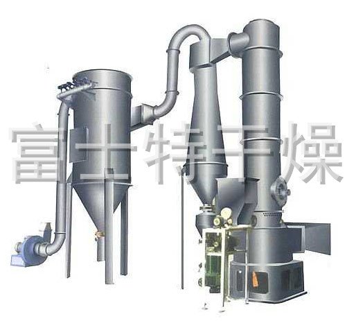 热空气切线进入干燥器底部,在搅拌器带动下形成强有力的旋转风场。膏状物料由螺旋加料器进入干燥器内,在高速旋转搅拌桨的强烈作用下,物料受撞击、磨擦及剪切力的作用下得到分散,块状物料迅速粉碎,与热空气充分接触、受热、干燥。脱水后的干物料随热气流上升,分级环将大颗粒截留,小颗粒从环中心排出干燥器外,由旋风分离器和除尘器回收,未干透或大块物料受离心力作用甩向器壁,重新落到底部被粉碎干燥。