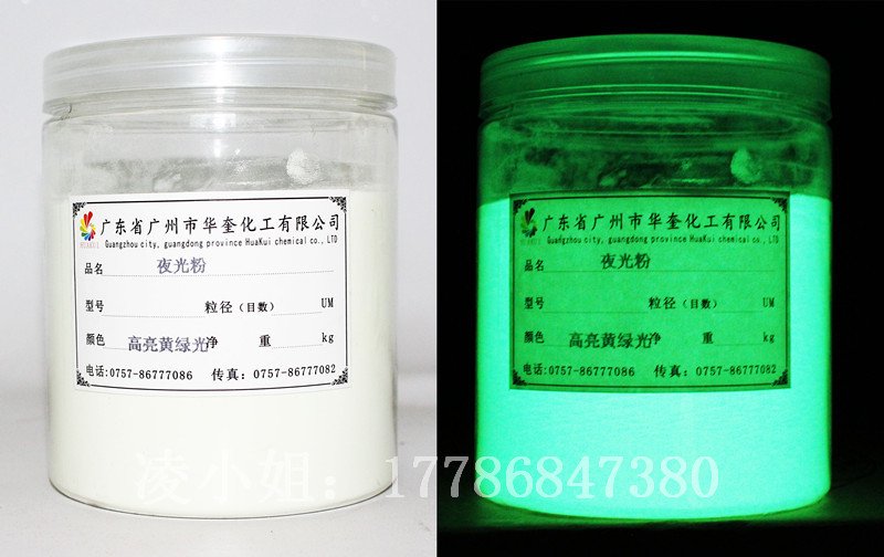 华奎颜料夜光粉:我司的超长余辉光致蓄光发光材料-夜光粉在吸收可见光15-30分钟后,于暗处可持续发光10小时以上,发光效果好,亮度高,时间长。
