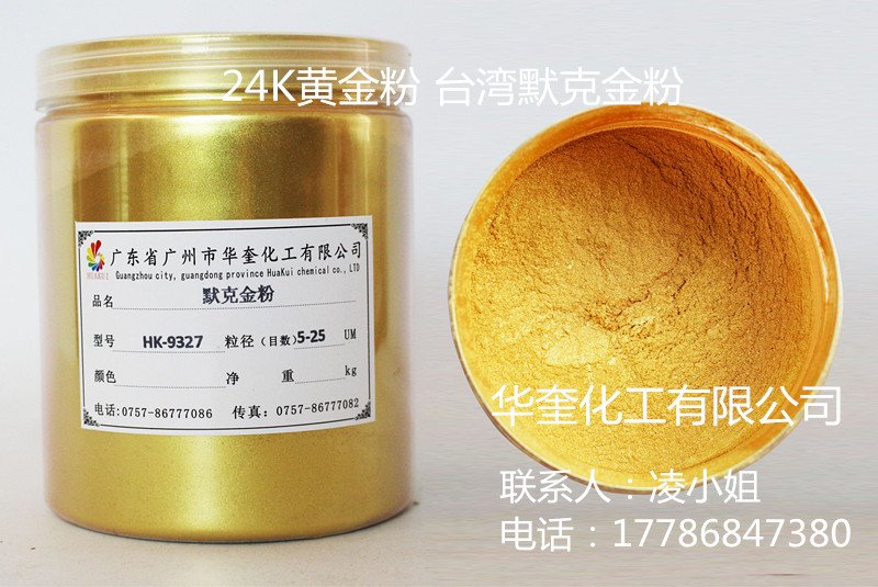 华奎化工有限公司999默克金粉它无毒无害,耐高温,耐光照,耐酸碱,不色变,不迁移,不导电等诸多优点,使其成为当代**特色及前途的新型颜料。规格: 200目 400目 800目高亮闪的999黄金粉又称金箔粉,做出产品颜色纯正,亮度高,适用于铁艺,工艺品,佛像,雕塑等工程。些效果并非普通珠光粉可比拟,可免费提供样品!金箔粉由新型合成高透明度片状晶体底材,包覆二氧化钛等金属氧化物组成,通过精密控制二氧化钛等金属氧化物的包覆厚度,产生黄金颜色一样的效果。特殊钻石珑光泽效果颜料赋予一个全新的、璀璨的、星光闪烁的、钻石般的光学维度空间及美妙的色调,这些富于情感的色彩及光泽,使终端产品的美丽、个性及品质得以充分展示。广州华奎化工珠光颜料主要包括珍珠银白色系列、金色系列、铁色系列、幻彩系列、彩色系列。珠光颜料呈粉状物,对人体无毒无害,可用于食品包装和儿童玩具;稀酸和碱不能侵蚀光颜料珠;珠光颜料对于环境无害,因为它们实际不溶于水,且不含任何重金属,属于对水质无害的等级;珠光颜料不能燃烧,也不自燃,不导电,能耐受800℃的高瘟;珠光颜料也可用于辐射固化体系(电子束固化,光固化)的反应型涂料中;珠光颜料的化学结构使其有优良的分散性能,能适用于水性涂料。广泛应用于汽车、摩托车、自行车涂料、粉末涂料、建筑涂料、珠光油墨、珠光皮革、珠光汽车,摩托车,自行车,油漆涂料,印刷油墨,化妆品,家具,美术字体,塑胶,陶瓷,皮革,(人造革),工艺品,纺织品,佛具,纸业,香业,玩具,装饰品等各种高档产品着色喷涂。(娱乐场所,洒店,宾馆,别墅等到装璜)