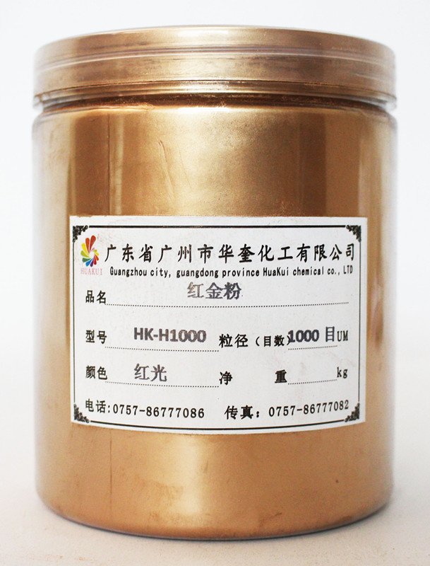 铜金粉是一种浮型片状颜料,由一定比例的铜、锌和铝合金,经熔炼、球磨、分级而成。其颗粒越粗,金属感越强,越闪烁,但遮盖力较差,反之,颗粒很小,其金属感越弱,色泽也越柔和,其遮盖力也越好。根据不同的应用领域和所需达到的金属效果,可通过选择不同颗粒直径和色相来实现。铜金粉专业零售批发17786******,华奎颜料产品的优势是:具有优异的颜色稳定性及重现性,具有逼真的金属视觉效果,贮藏稳定,耐久性好,耐候性好,附着牢固等特点。华奎彩铜金粉是高档环保铜金粉,通过SGS检测,金属光泽强,稳定性能好,色泽纯正亮丽,金属感特强、特亮、特闪、遮盖力强、抗氧化性能强、每批次产品性能稳定,华奎颜料实力雄厚,供货能力强,长期大量批发供应铜金粉系列。本品广泛应用于油漆、油墨、涂料、塑胶、硅胶、印刷、印花、皮革、玩具、工艺品等行业。根据不同的应用领域和所需达到的金属效果,可通过选择不同颗粒直径和色相来实现。