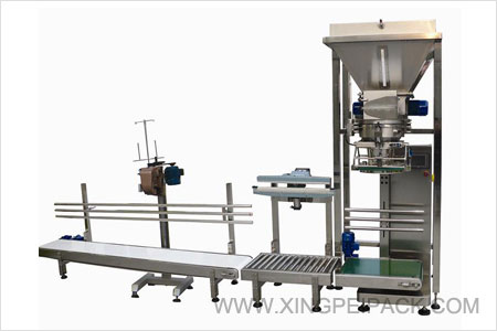 一、人工辅助大袋粉剂粉末产品自动计量装袋包装机 简要说明: 该半自动充填包装机能自动完成计量、夹袋、充填、封口、缝包、传送等工作。由于是按照国家GMP标准而设计,以至于适用于包装那些易流动或流动性极差的粉粒状物料, 如奶粉、饲料、米粉、白糖、咖啡、味精、固体饮料、葡萄糖、米粉、固体医药、农药、粉粒状添加剂、染料等。 二、人工辅助大袋粉剂粉末产品自动计量装袋包装机 特点: 1、整机除电机、气缸、电器配件、气动元件、缝包机外其它均为不锈钢制作,特别适用GMP认证,食品卫生认证,要求抗腐蚀化工产品等的包装。 2、具有过冲抑抑制,落差修正,超差报警等功能。 3、采用新型的国际流行的包装秤控制系统,高精度高速计量专用仪表,功能强,可靠性高,完全适应连续生产的要求。 4、人工辅助大袋粉剂粉末产品自动计量装袋包装机 可设定时间自动双节PVC输送带(骨架为全不锈钢)轻松传递,整洁、干净、美观,可用水冲洗。 5、设有校准程序(配有砝码):可随时方便进行校准,对长时间不用的重量飘移特别有用。 6、方便清除残料:螺旋可直接插拨抽出单独清洗。