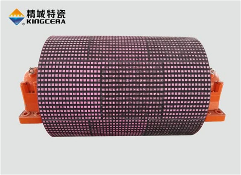 在施工过程中,用德国进口高强度粘合剂将衬板粘到金属筒体后,相互挤紧,使之没有间隙;同时陶瓷与橡胶硫化接触面有独特的“燕尾槽”设计,陶瓷与橡胶紧紧吻合在一起,保证陶瓷不会从橡胶里跑出来。我公司生产的热硫化陶瓷包胶与金属滚筒粘接力为12牛/毫米,硫化时压强50公斤/平方厘米;而传统橡胶包胶与金属滚筒粘接力仅为3-10牛/毫米,压强6-8公斤/平方厘米,所以橡胶密实度低,耐磨性能差;同时与胶带附着力小,加剧了胶带的拉伸应力,较快老化,导致橡胶过硬,引起物料粘接,以致于频繁更换。