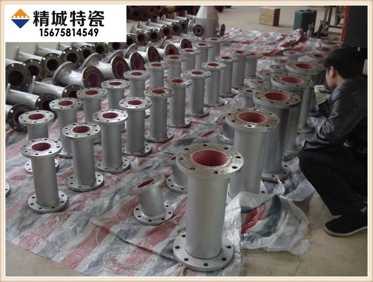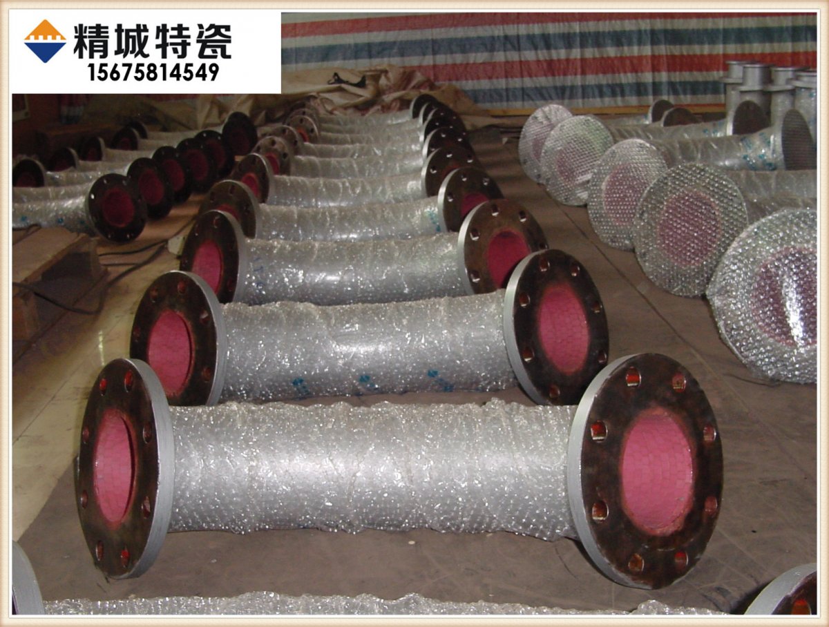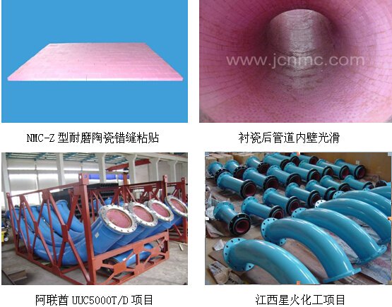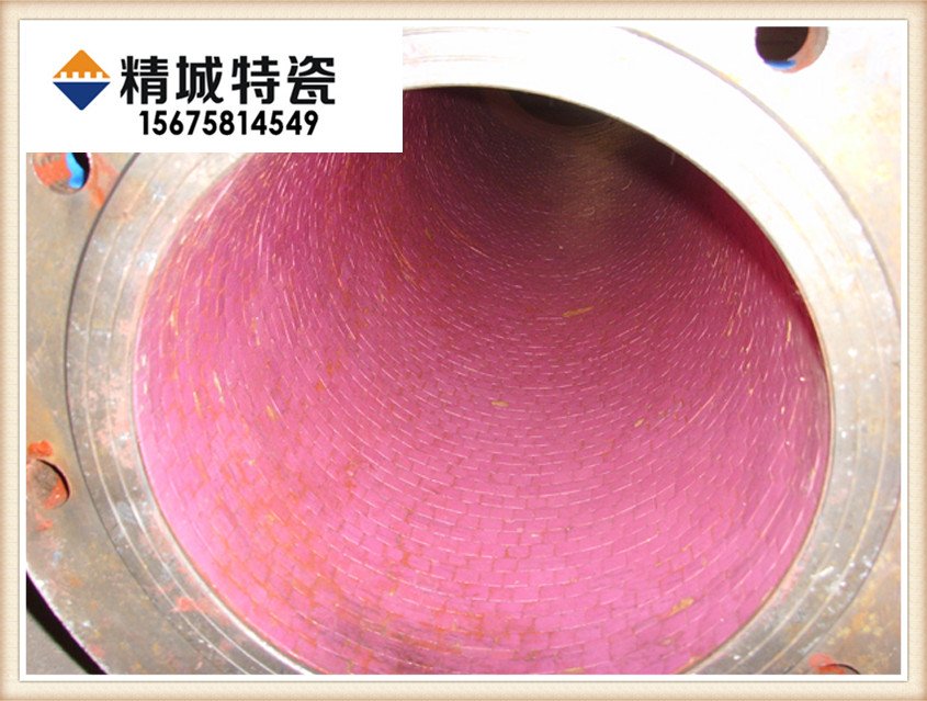 衬5mm厚)型耐磨陶瓷内衬管。我公司耐磨陶瓷采用与清华联合研发的350度超强耐温防腐无机粘胶粘接,工艺上由传统直接粘贴改为采用每圈错位拱接安装,