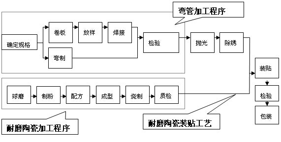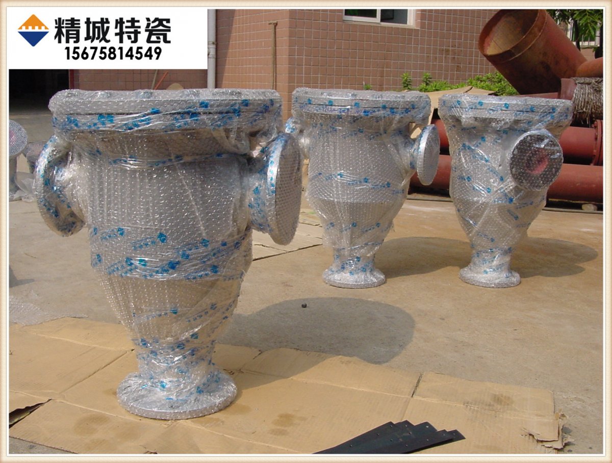 耐磨陶瓷内衬弯头是利用氧化铝耐磨陶瓷的高耐磨耐腐蚀性能,采用耐高温强力粘胶拱接在弯头内壁,经过固化形成牢固防磨层。钢件采用20#一体热弯成型,内衬光滑致密;同时为避免沿风向形成直线型缝隙,垂直于风采用错位粘贴装贴工艺。这种弯头使用寿命是双合金弯头的6倍以上,但重量仅为合金弯头的1/3,广泛用于气力及流体输送管道。