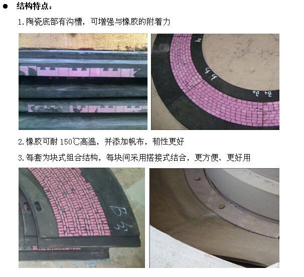 立磨陶瓷密封环是为解决立磨密封环容易泄漏及磨损而设计的,是采用先进的热硫化工艺将特种氧化铝刚玉耐磨陶瓷按照一定的布局硫化在特种橡胶内,既发挥了氧化铝陶瓷耐高温磨损、耐腐蚀性能,又发挥了橡胶材料高强度、高韧性和密封性好的特点,一体化设计,便于更换和安装。更重要的是,它可以完全替代进口产品,因此一问世便受到客户的青睐。