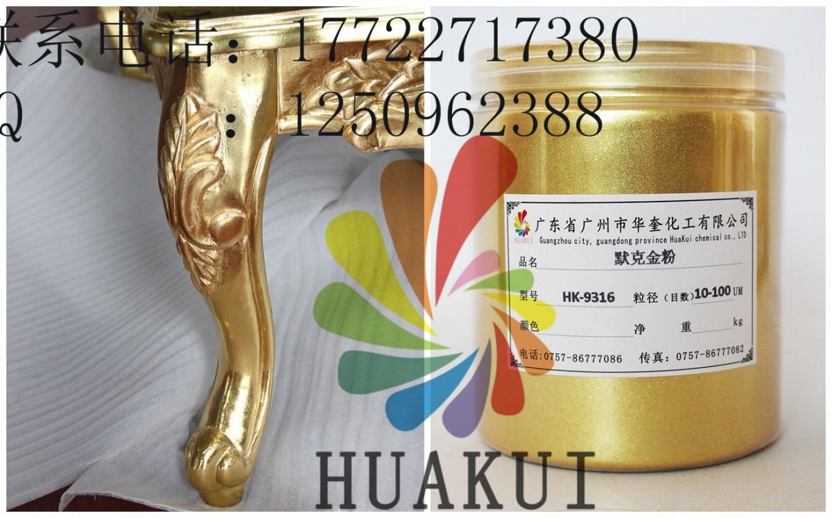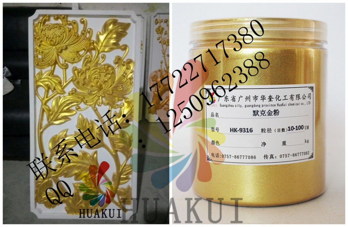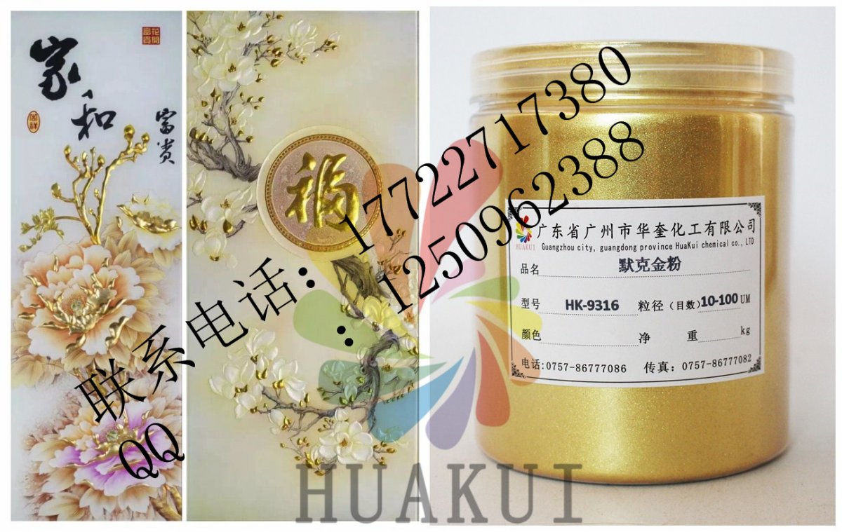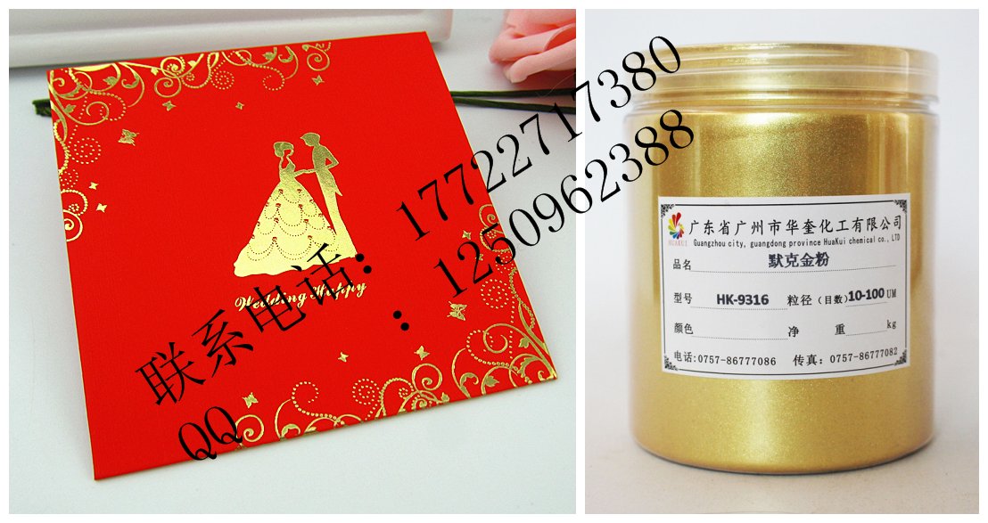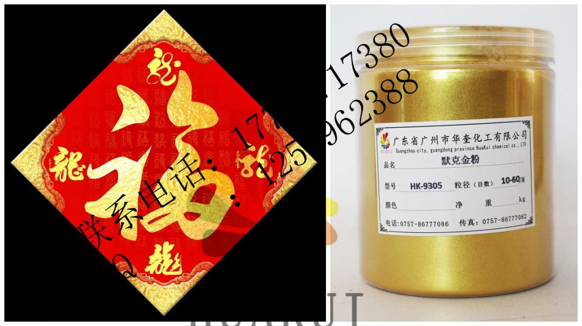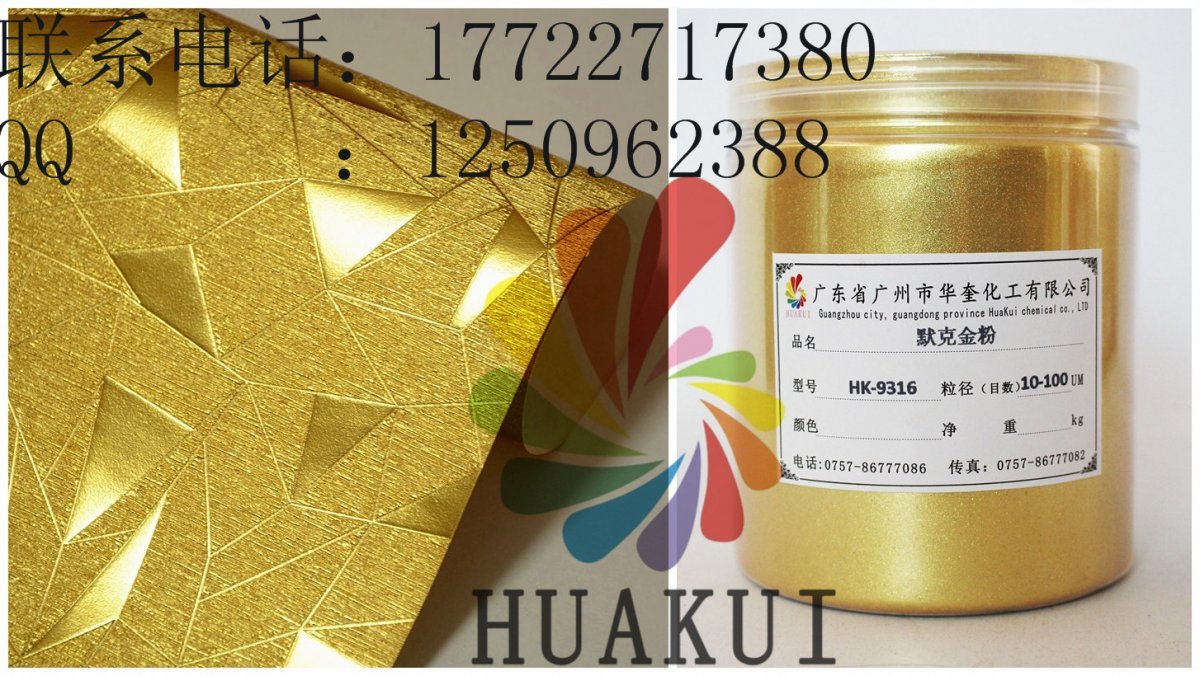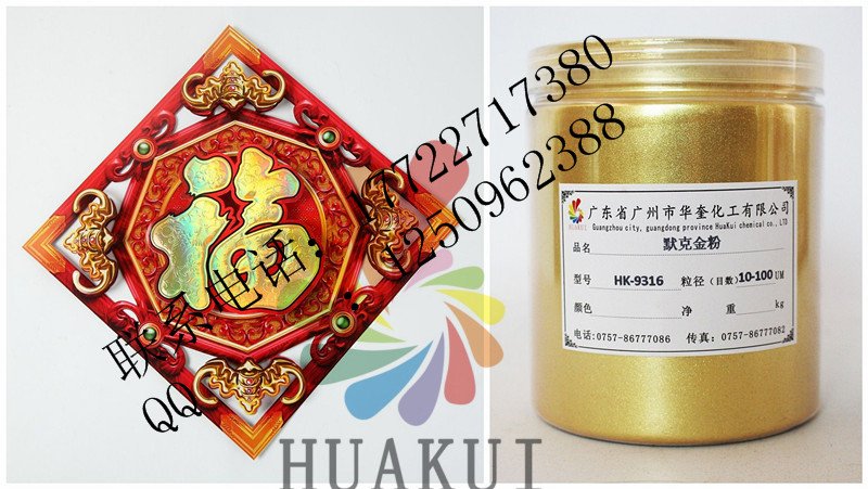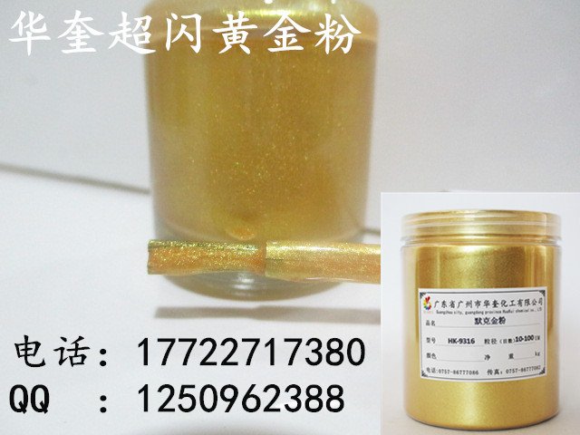 广州华奎金箔粉由新型合成高透明度片状晶体底材,包覆二氧化钛等金属氧化物组成,通过精密控制二氧化钛等金属氧化物的包覆厚度,产生黄金颜色一样的效果。特殊钻石珑光泽效果颜料赋予一个全新的、璀璨的、星光闪烁的、钻石般的光学维度空间及美妙的色调,这些富于情感的色彩及光泽,使终端产品的美丽、个性及品质得以充分的展示。
