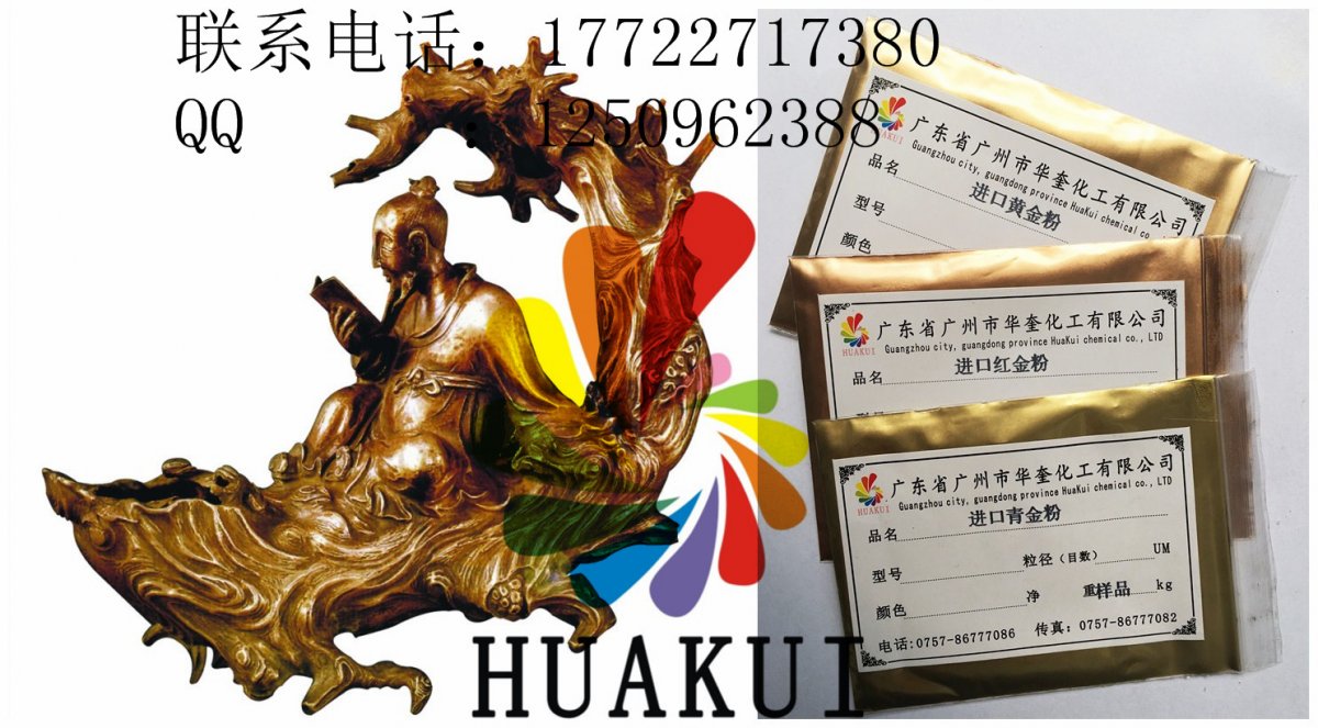 广州华奎铜金属粉是一种浮型片状颜料,由一定比例的铜、锌和铝合金,经熔炼、球磨、分级到所需要的规格和效果而成。铜金粉的色相可分为青金青金红金、紫铜古铜粉等。
